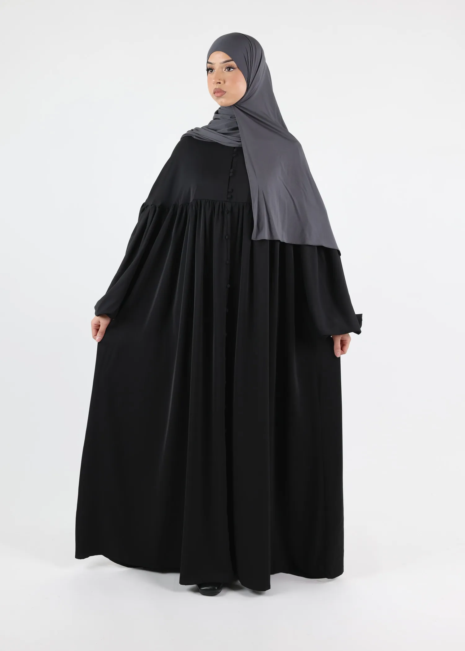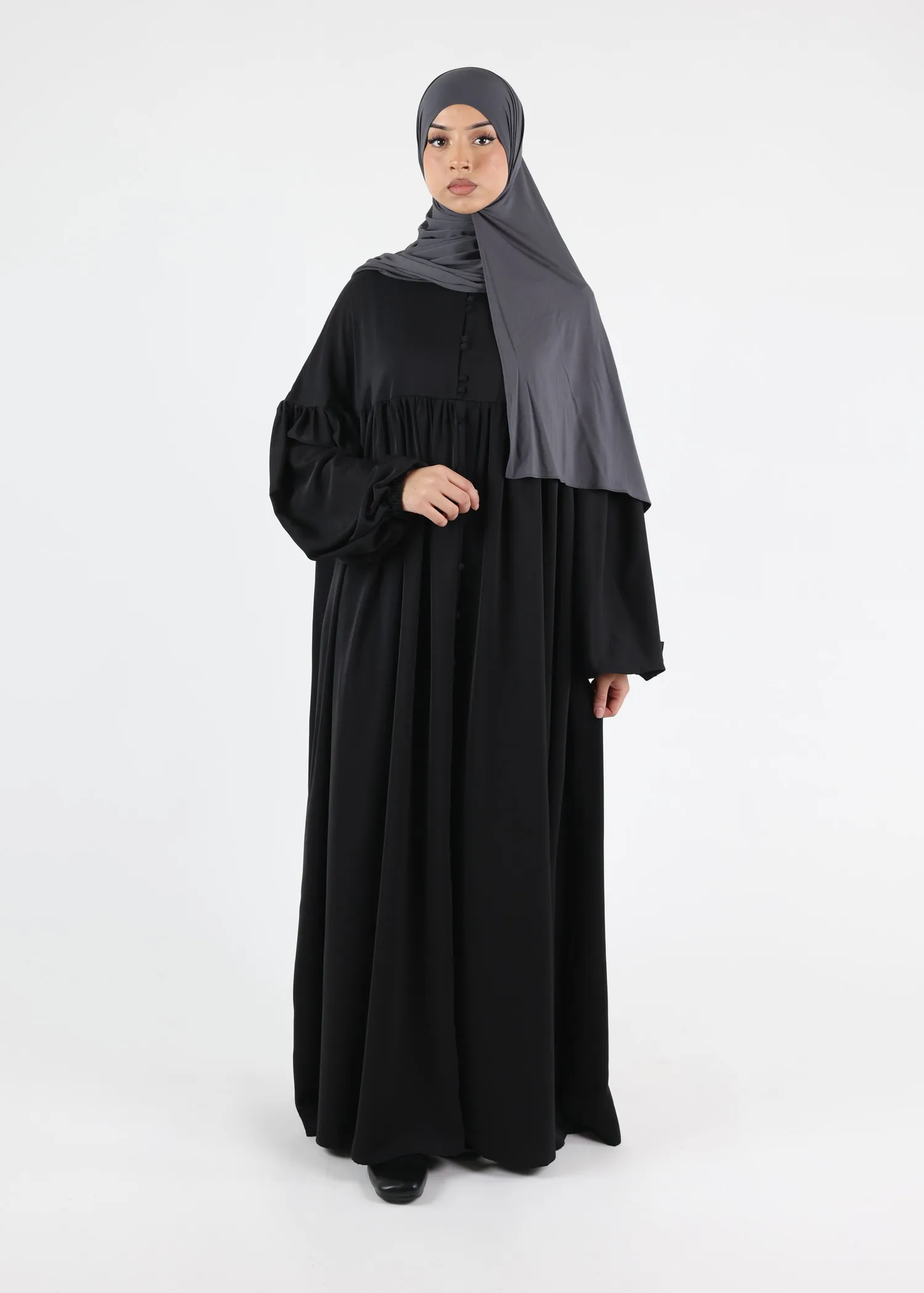 • Functional and Decorative Buttons: Functional buttons on the top provide practicality and ease of wear, while decorative buttons running from under the pleated detailing enhance the abaya’s stylish charm.