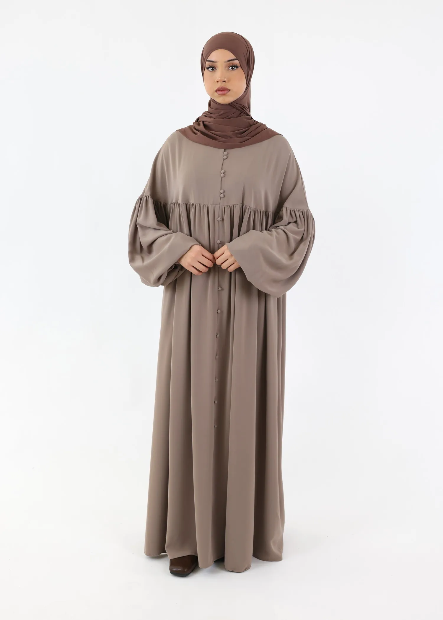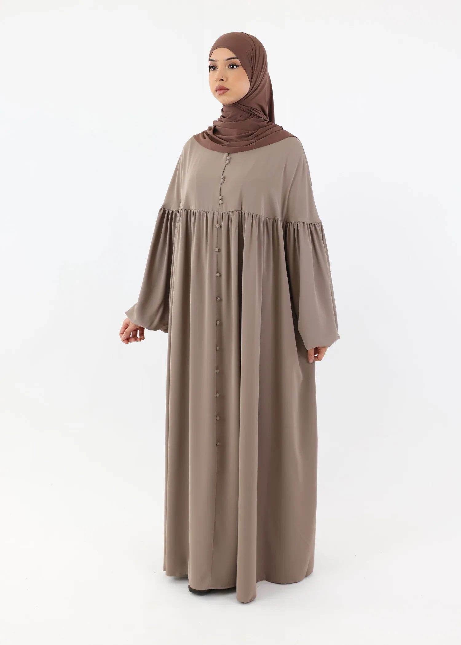 • Functional and Decorative Buttons: Functional buttons on the top provide practicality and ease of wear, while decorative buttons running from under the pleated detailing enhance the abaya’s stylish charm.
