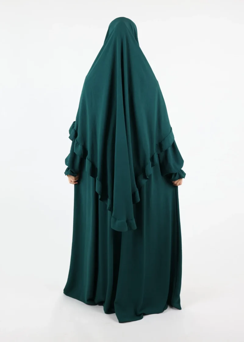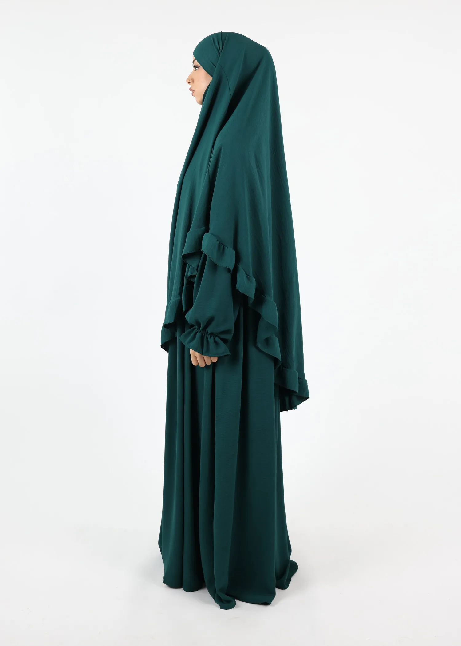 A long rounded khimar featuring delicate ruffles, adding a subtle feminine touch to the overall look.