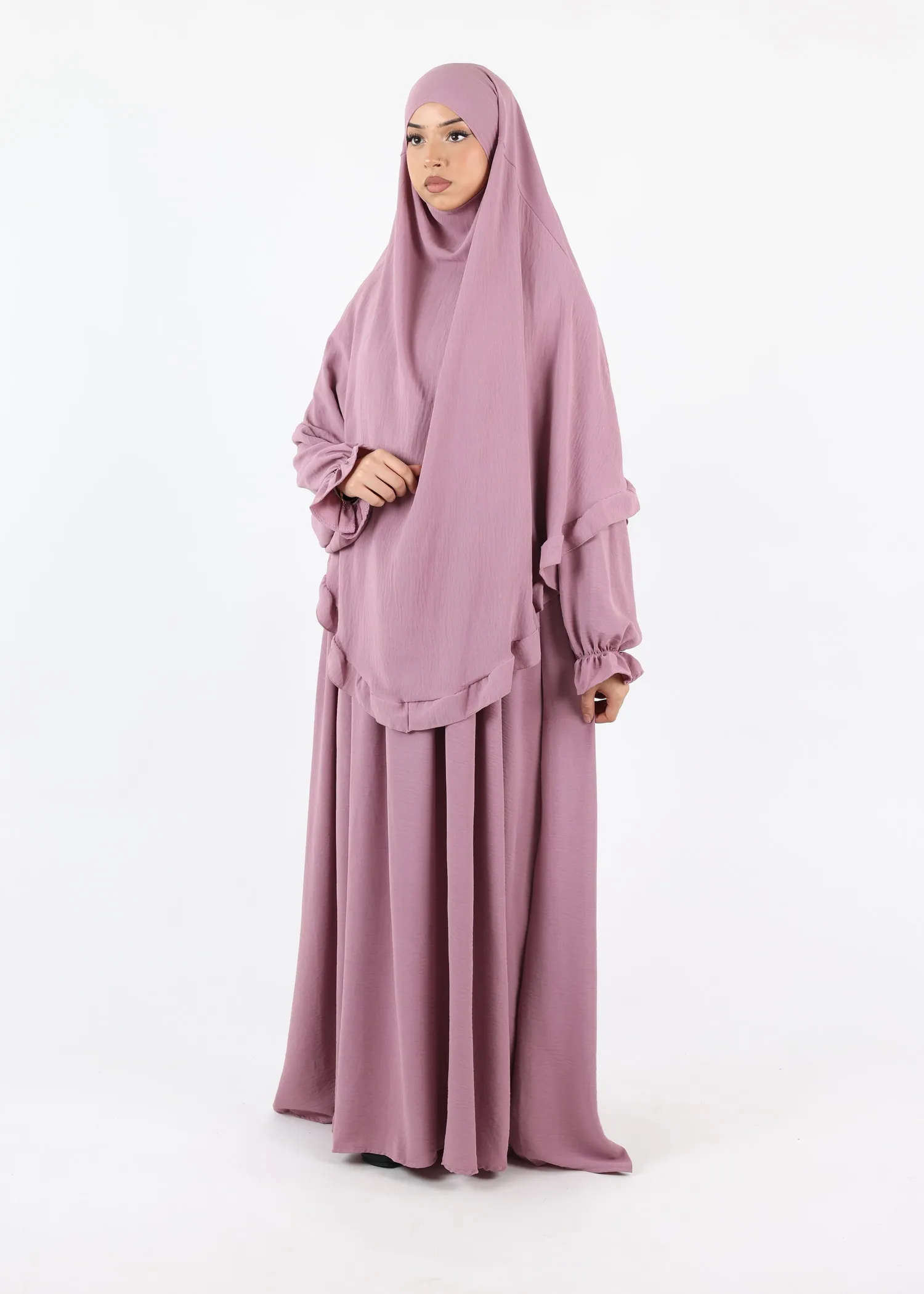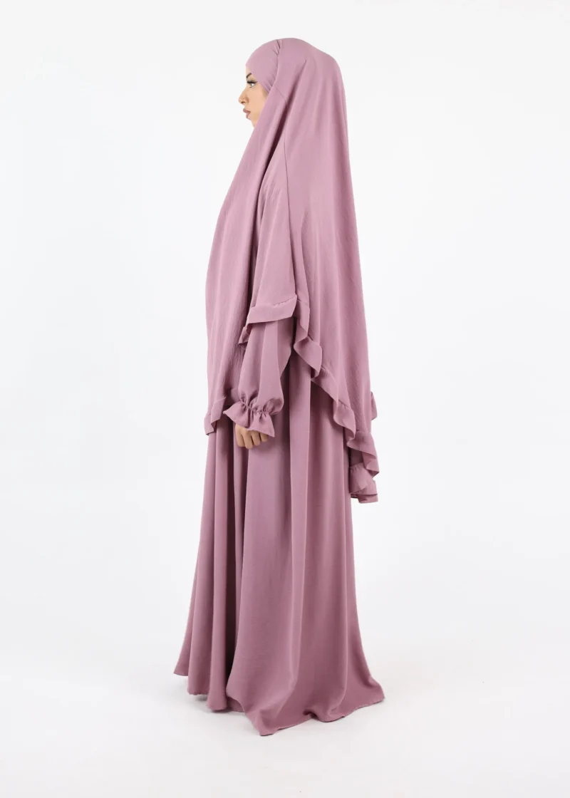 A long rounded khimar featuring delicate ruffles, adding a subtle feminine touch to the overall look.