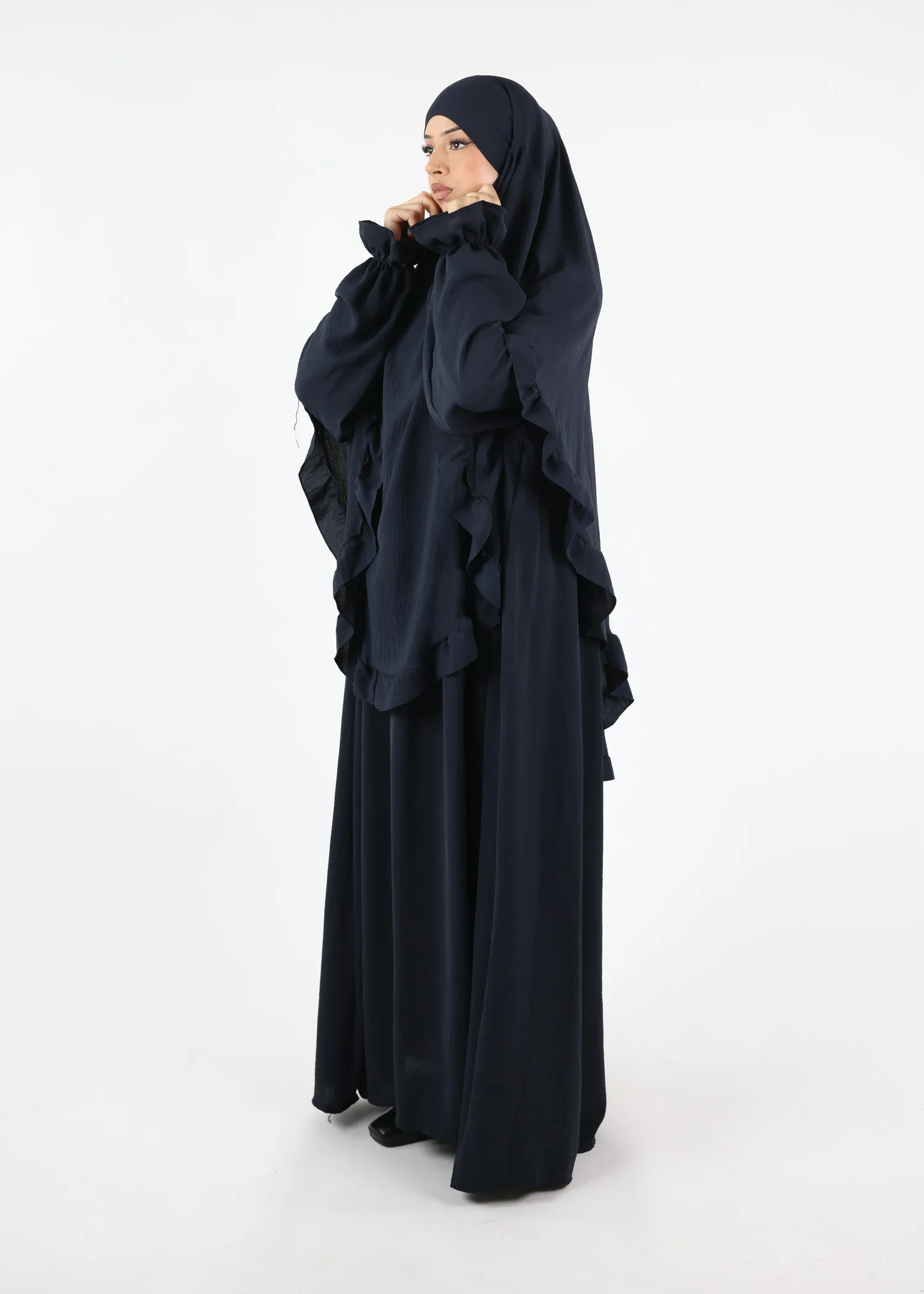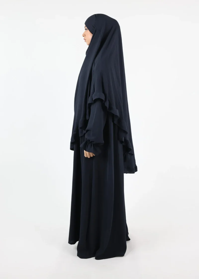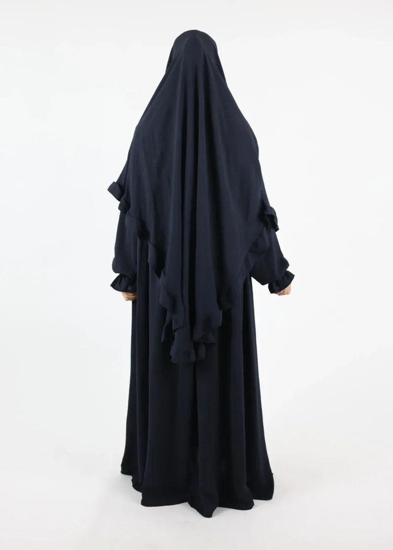 A long rounded khimar featuring delicate ruffles, adding a subtle feminine touch to the overall look.