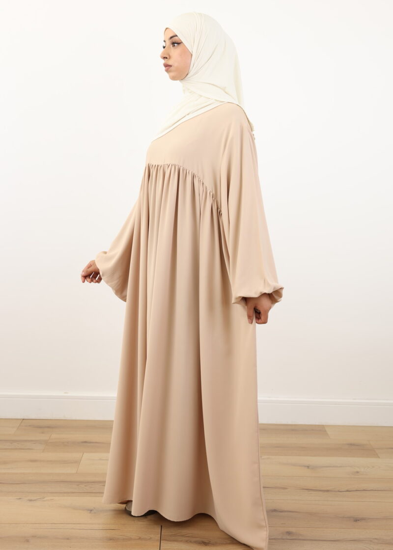 The El Malika strikes the perfect balance between modesty and modernity. Its round collar closes elegantly at the back with a discreet button, while the Korean Medina fabric provides a soft, lightweight, and comfortable drape that flows beautifully with every step. This fabric choice ensures all-day comfort while maintaining a refined and polished appearance.