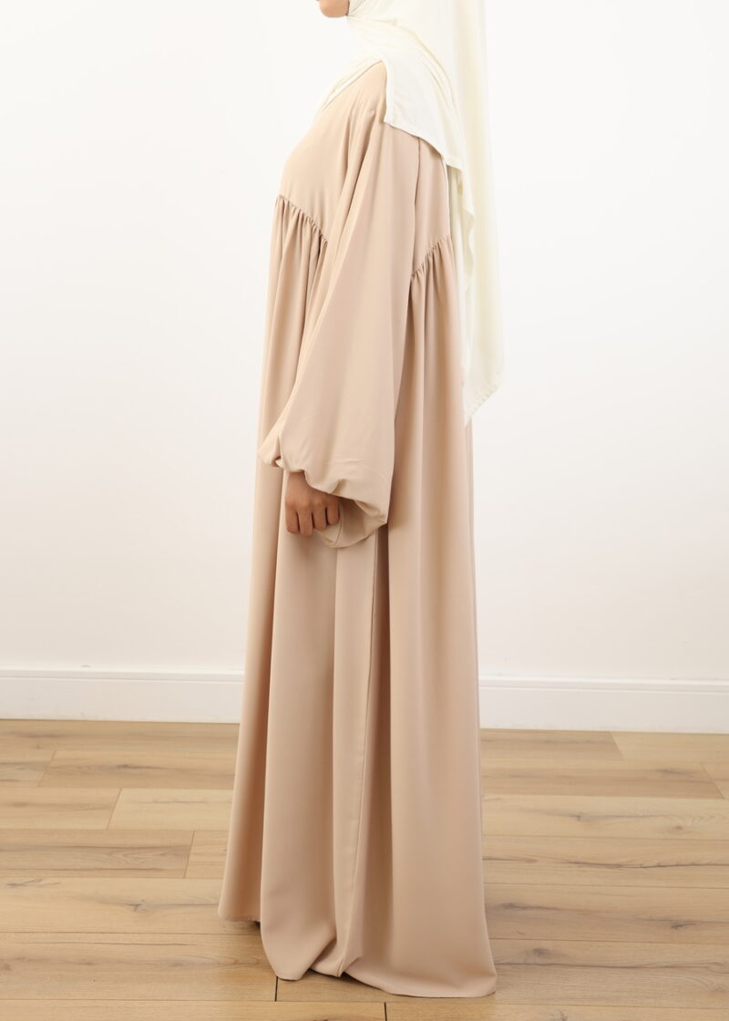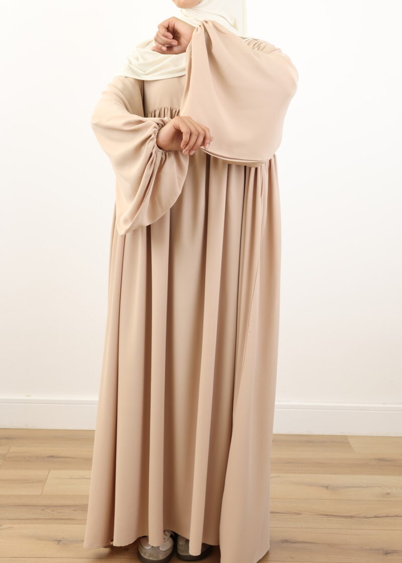 • A stunning long, flowing, and flared abaya whose fullness creates a majestic charm.
