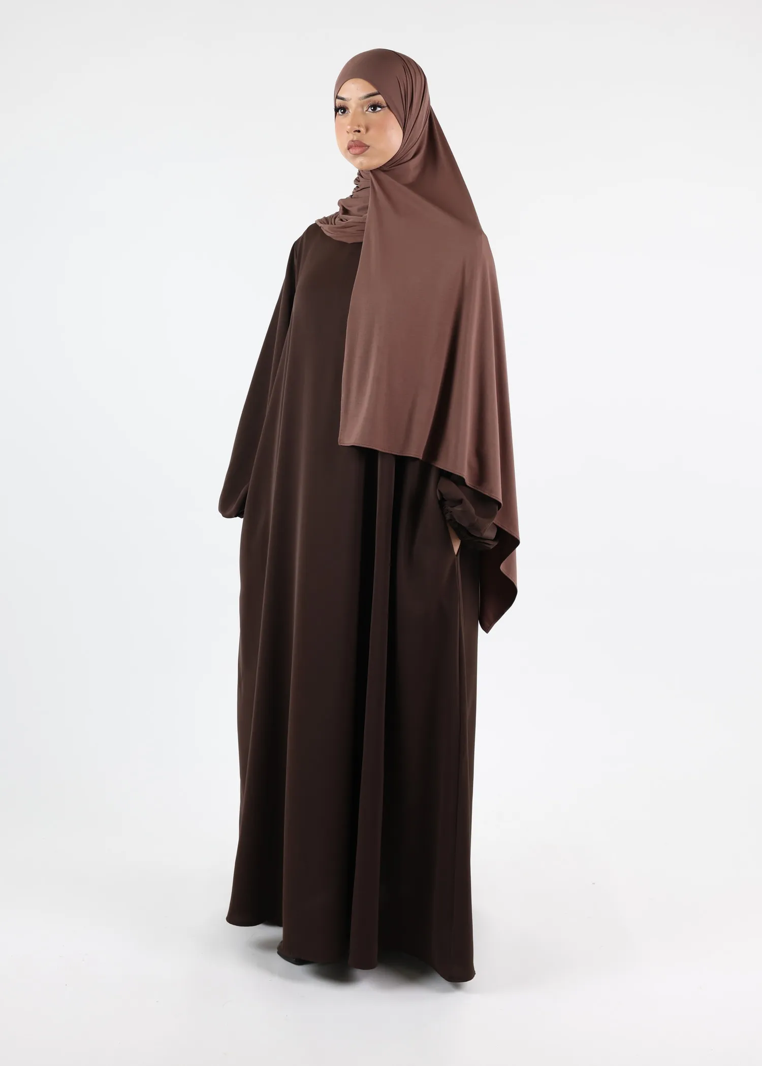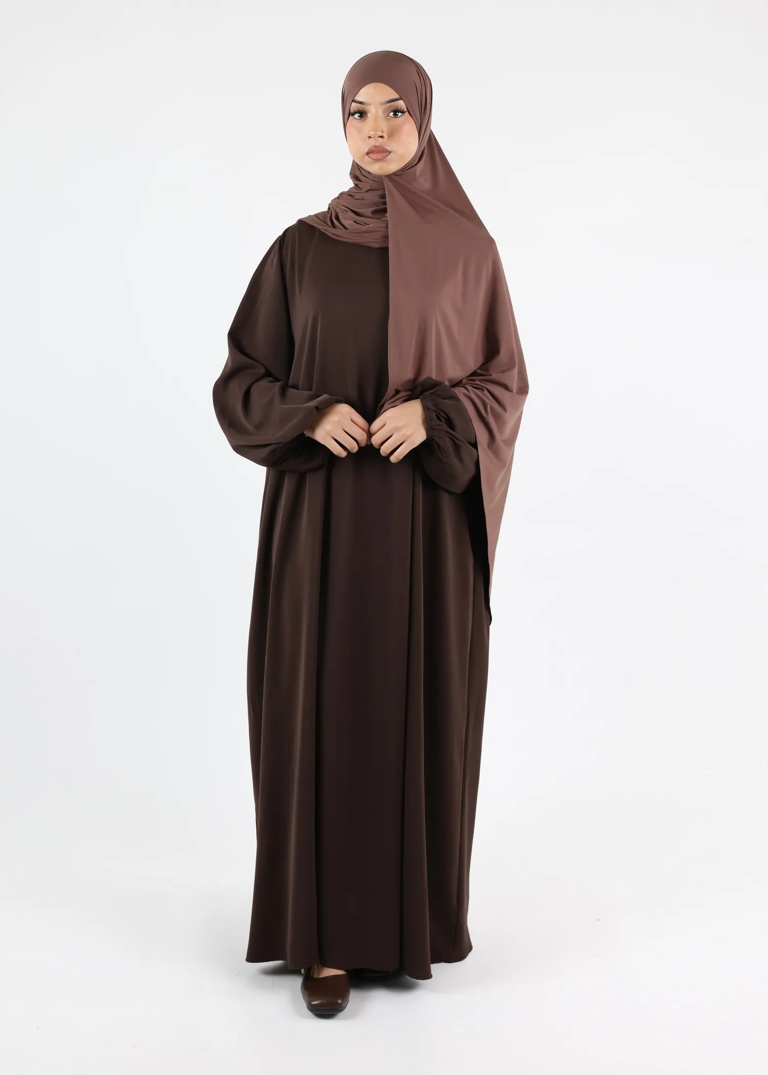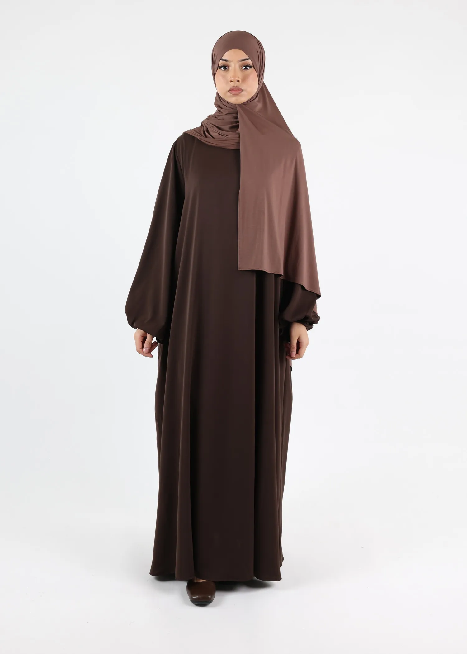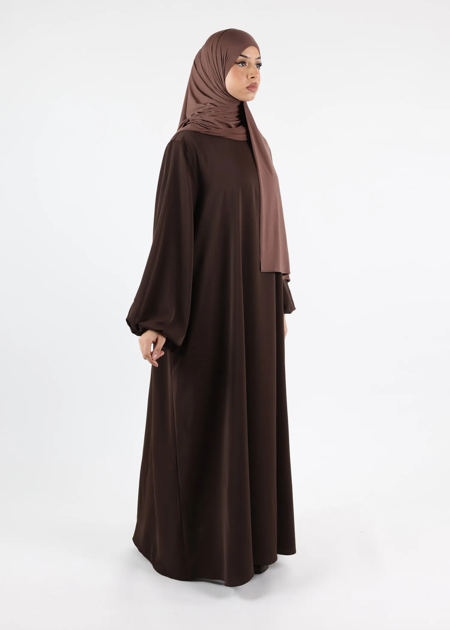 The loose, flowing cut ensures full modest coverage and ease of movement. Its minimalist silhouette is enhanced by elegant balloon sleeves, designed to hold their shape while maintaining a soft, structured fall. Discreet side pockets are integrated into the design, adding practicality without compromising the clean lines of the abaya.