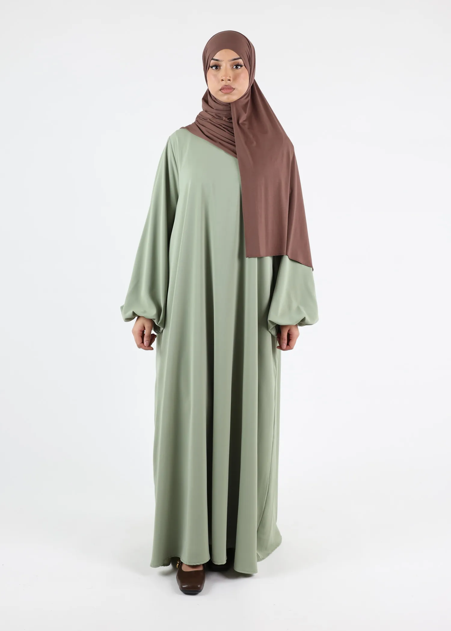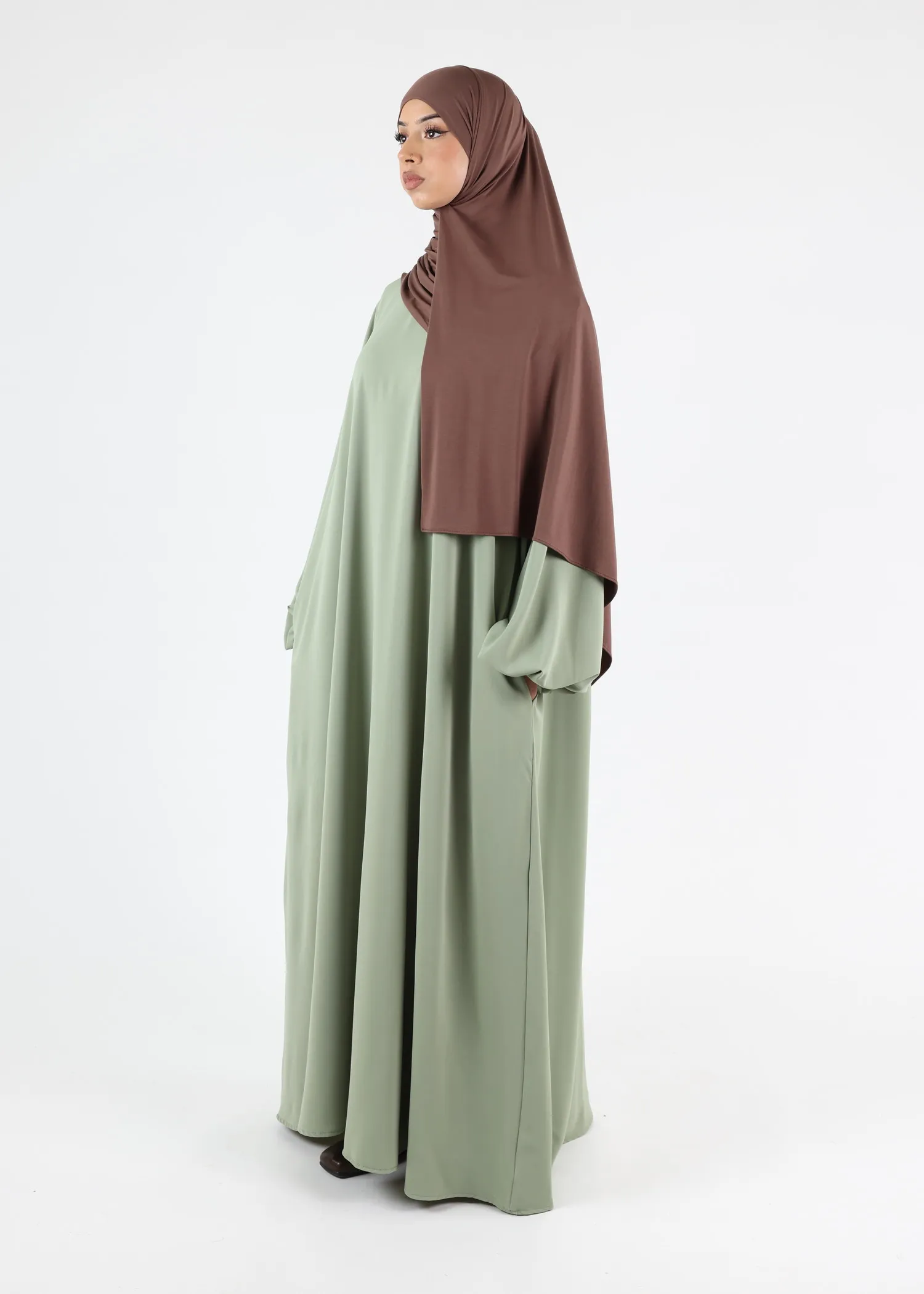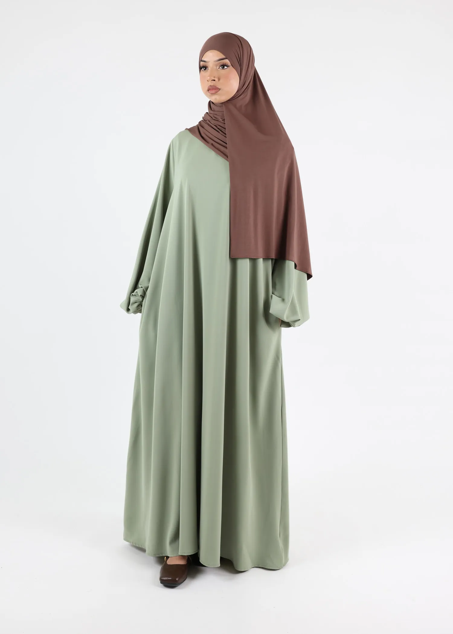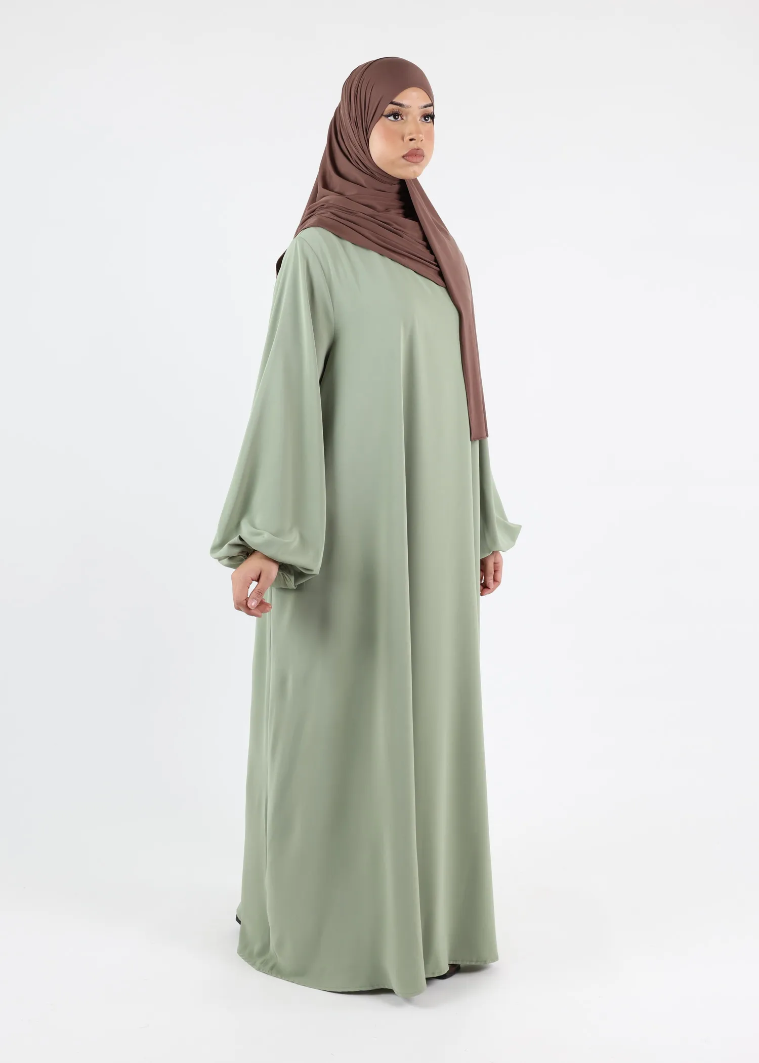 The loose, flowing cut ensures full modest coverage and ease of movement. Its minimalist silhouette is enhanced by elegant balloon sleeves, designed to hold their shape while maintaining a soft, structured fall. Discreet side pockets are integrated into the design, adding practicality without compromising the clean lines of the abaya.