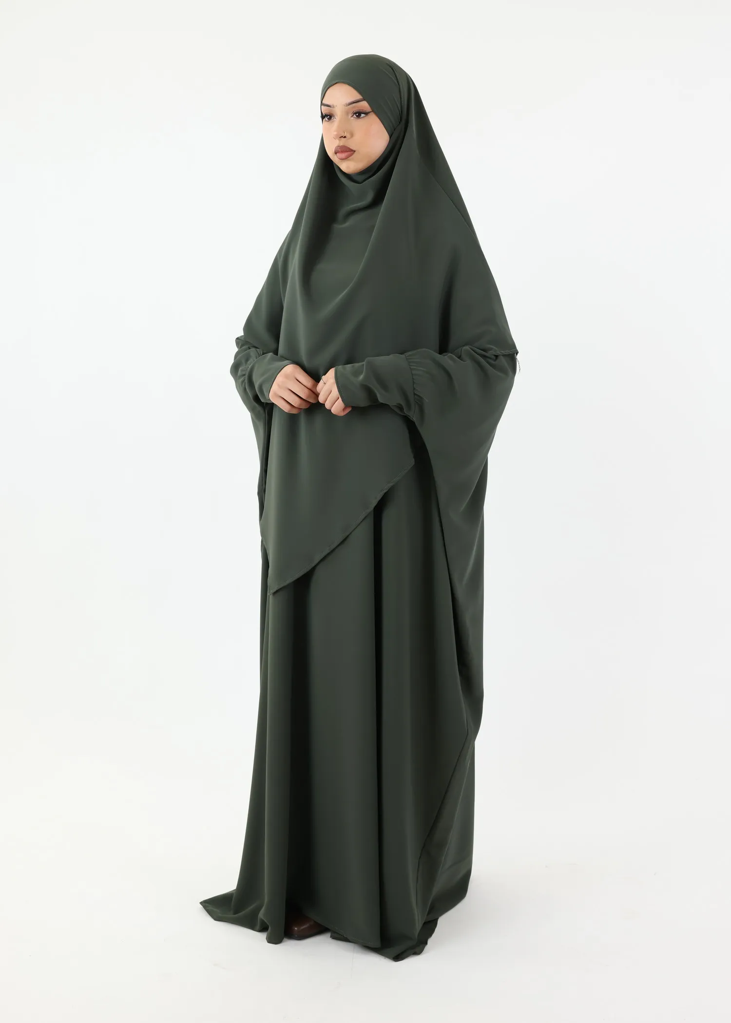 • Composed of 2 pieces: a very loose abaya farasha (butterfly) and a long pointed khimar.