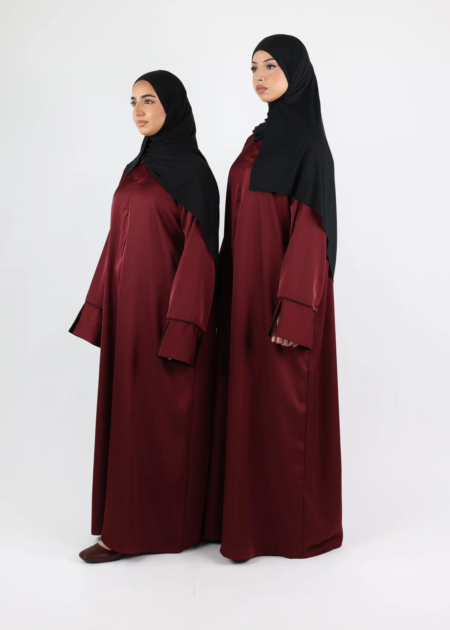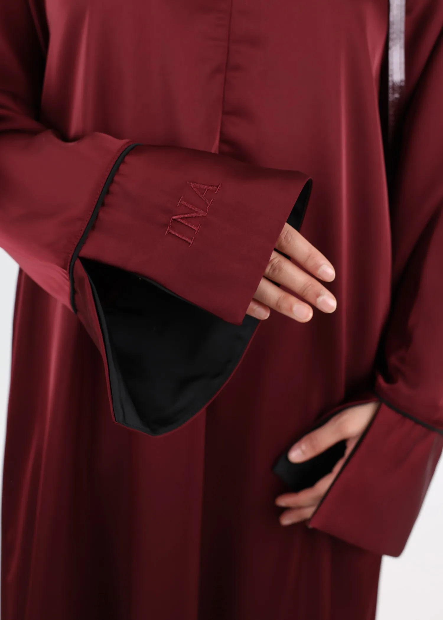 One of the defining features of this satin abaya is its wide sleeves, open on one side down to the wrist. The inner sleeve is fully lined in contrasting satin, creating a subtle yet refined contrast between the outer fabric and the interior.