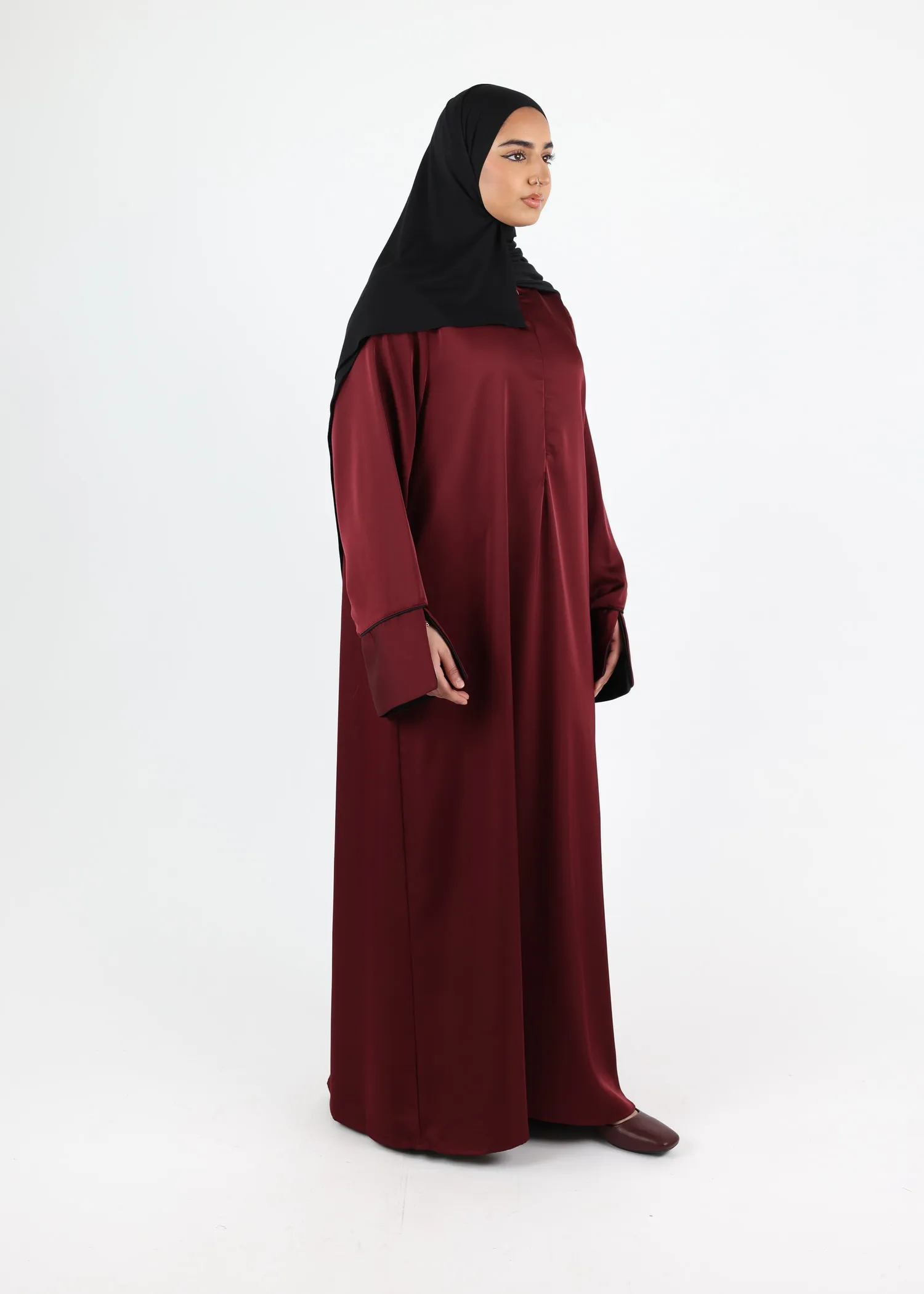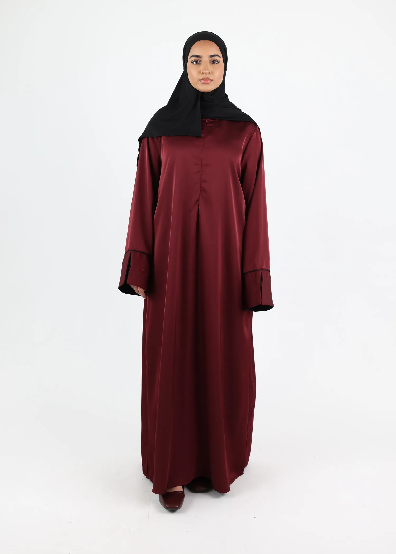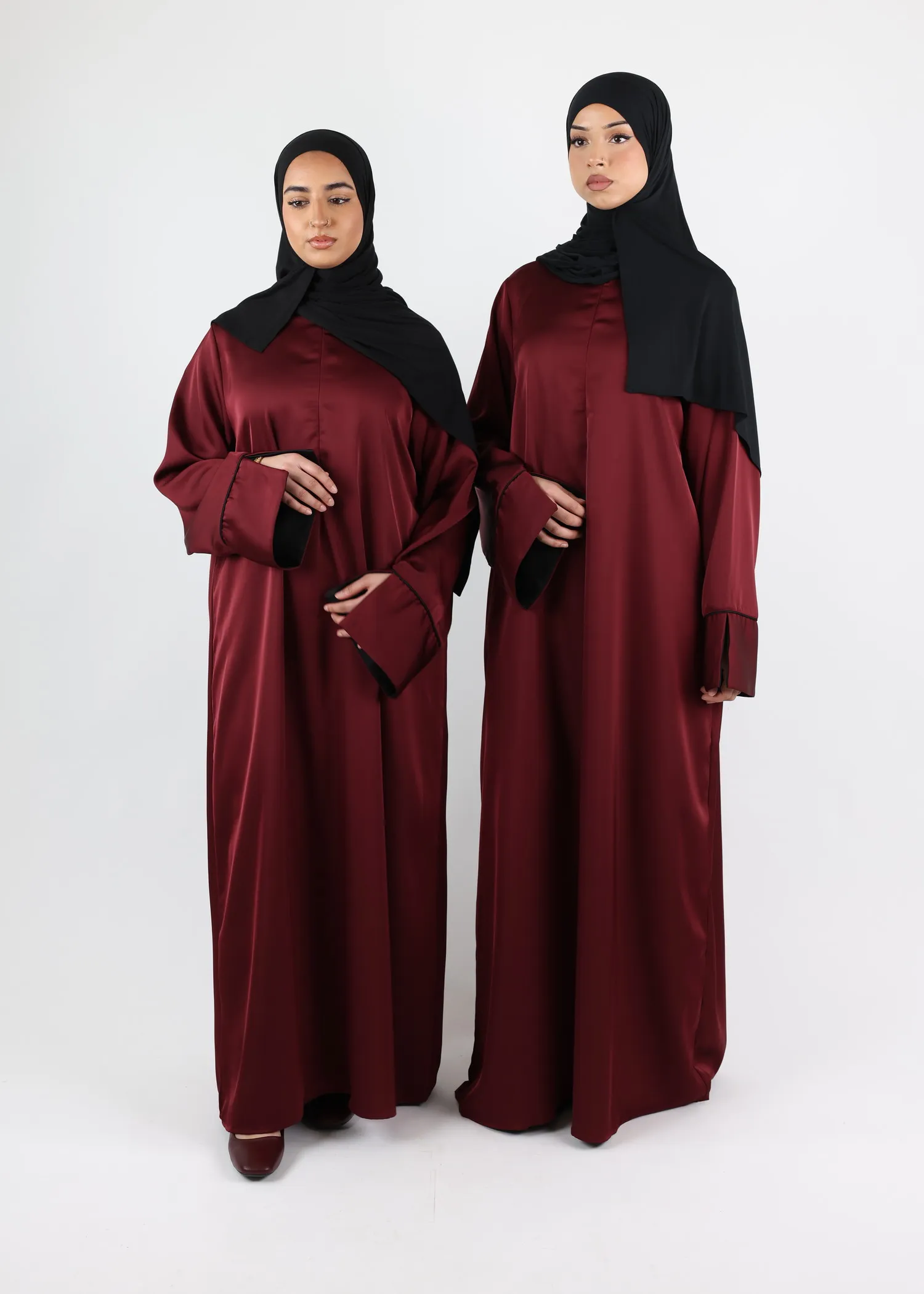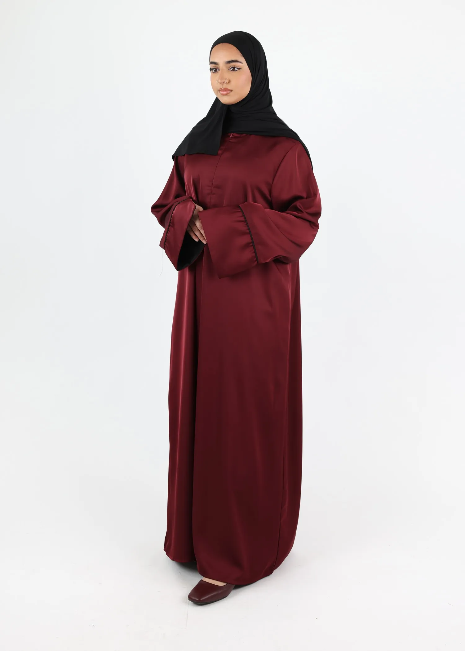 This elegant satin abaya pairs perfectly with a matching satin khimar or hijab (not included) for a coordinated modest outfit.