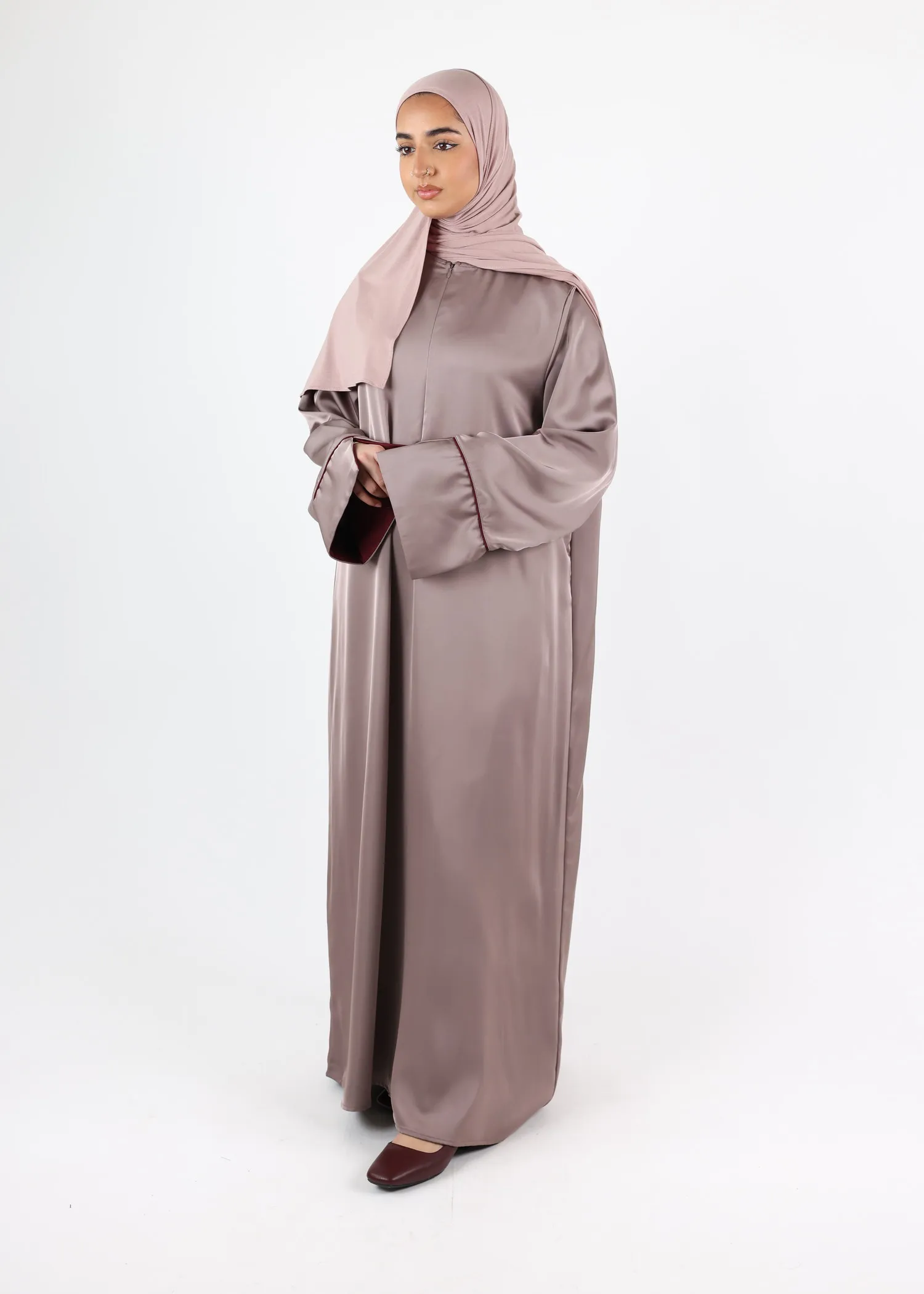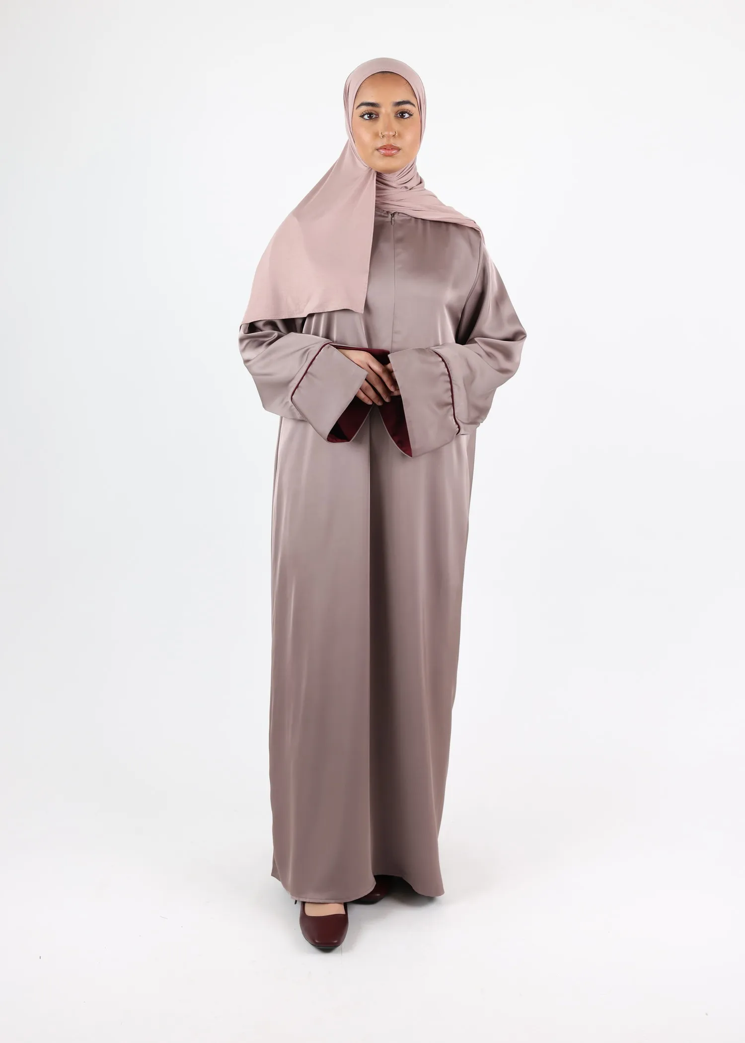 This elegant satin abaya pairs perfectly with a matching satin khimar or hijab (not included) for a coordinated modest outfit.