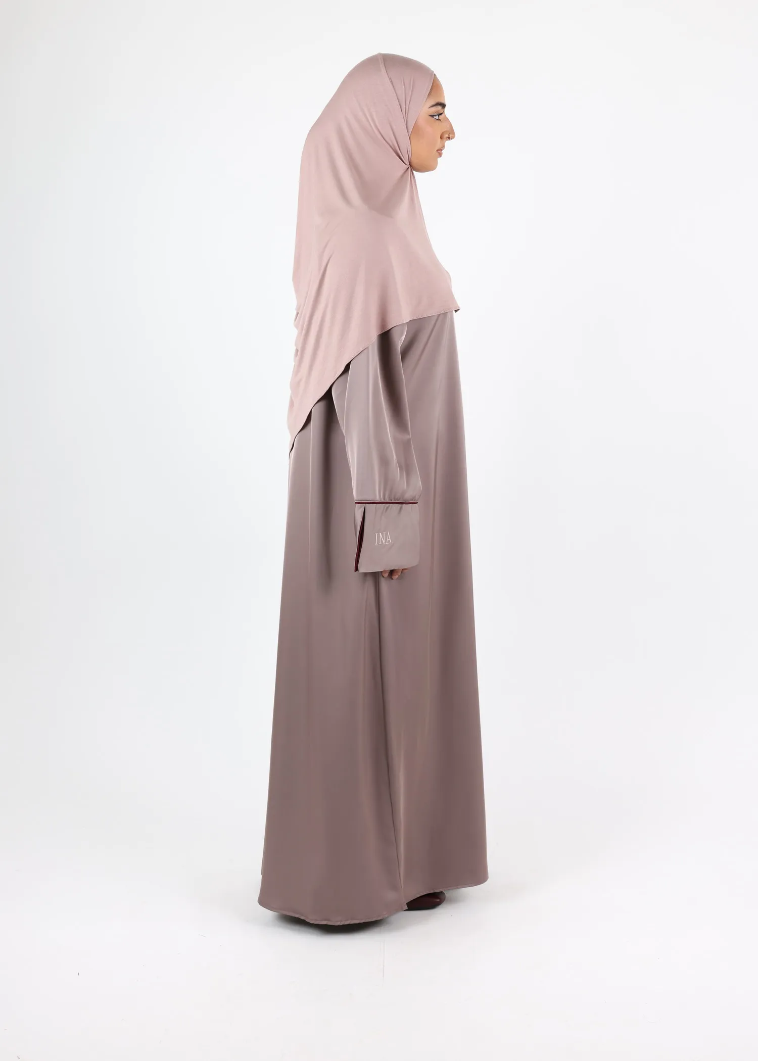 One of the defining features of this satin abaya is its wide sleeves, open on one side down to the wrist. The inner sleeve is fully lined in contrasting satin, creating a subtle yet refined contrast between the outer fabric and the interior.