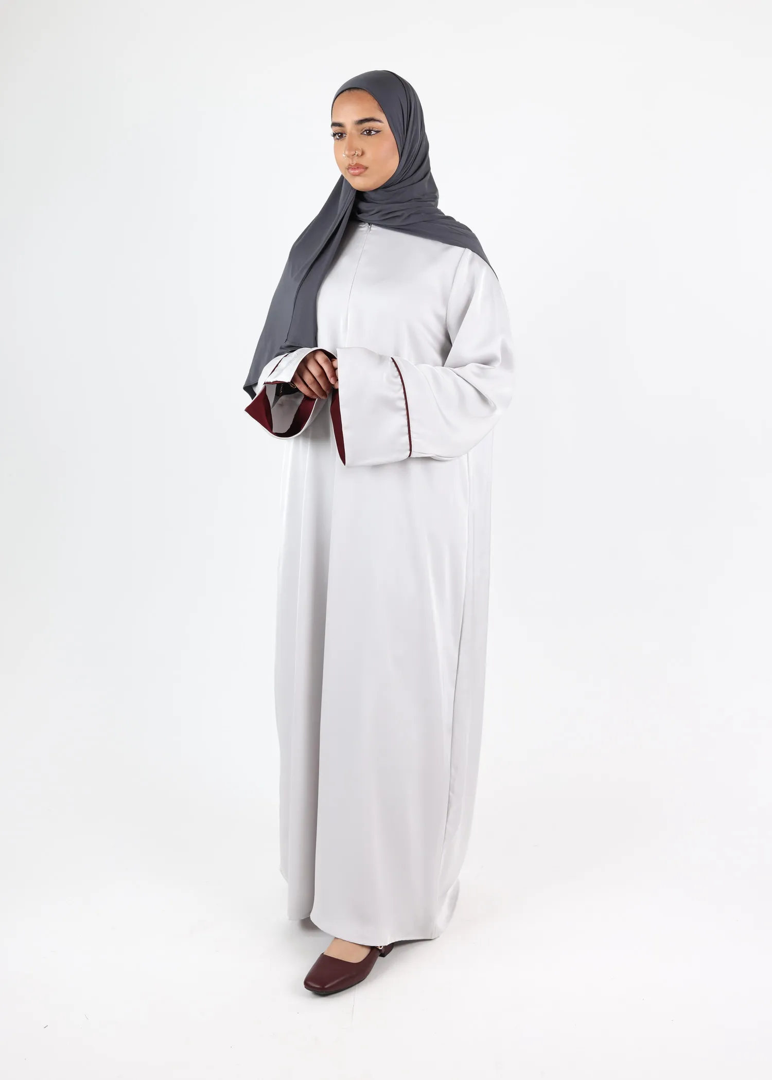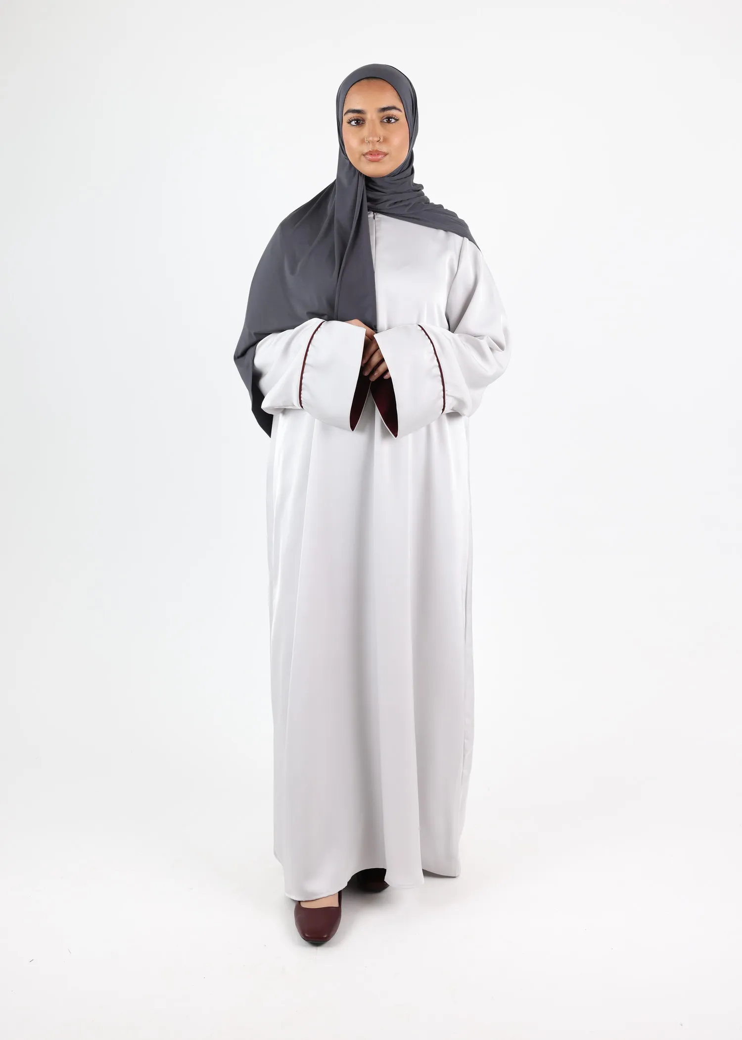 This elegant satin abaya pairs perfectly with a matching satin khimar or hijab (not included) for a coordinated modest outfit.