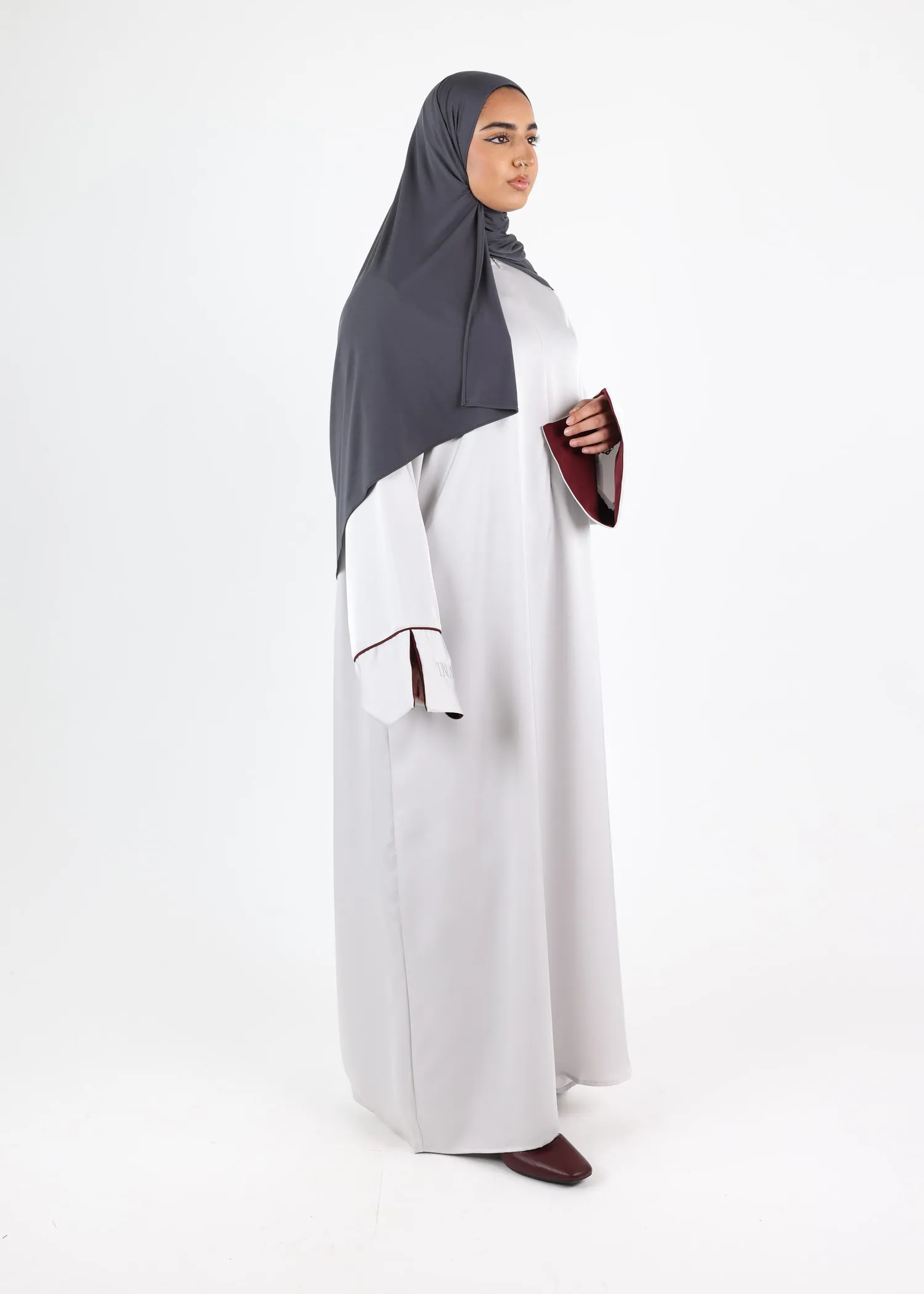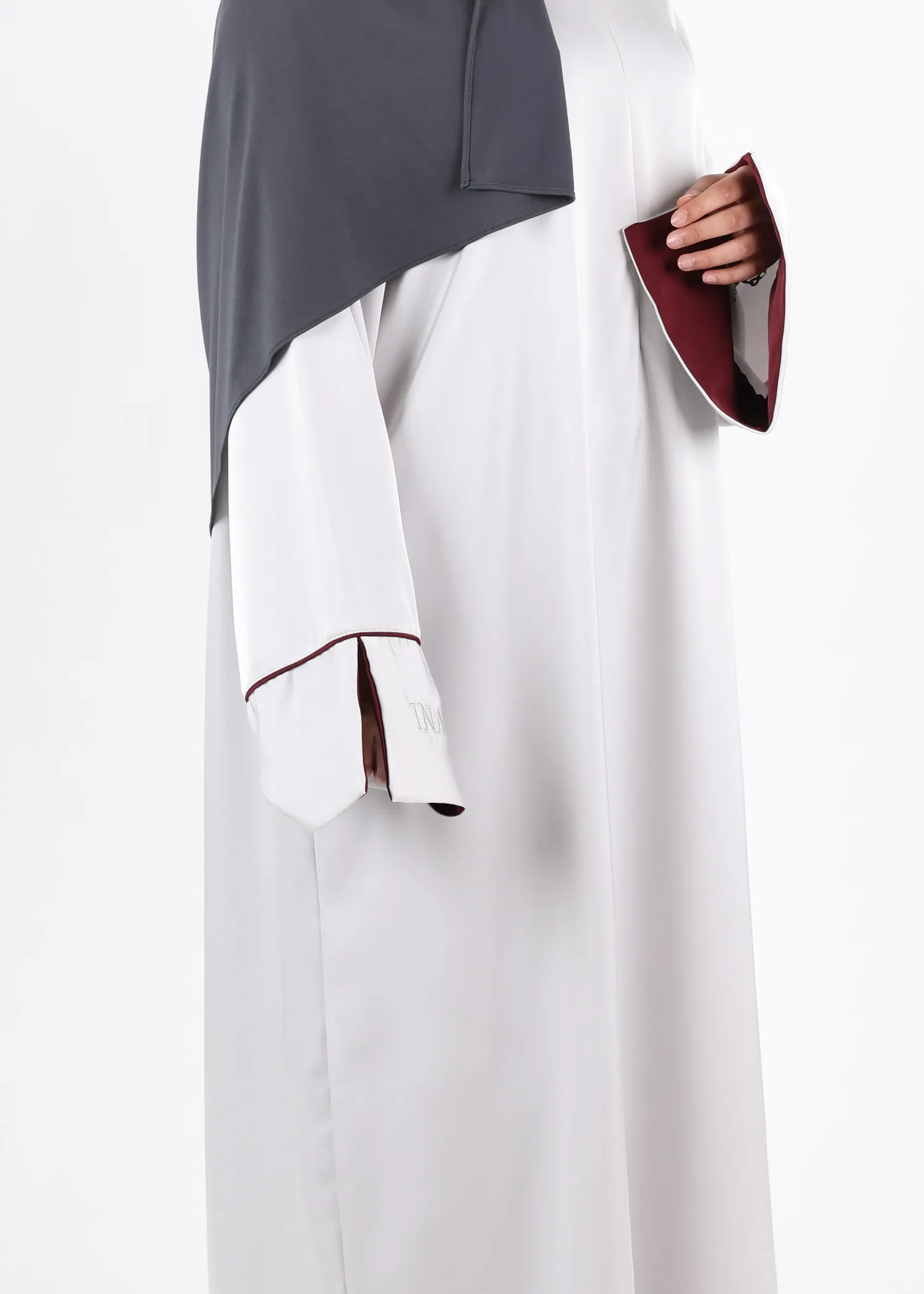 One of the defining features of this satin abaya is its wide sleeves, open on one side down to the wrist. The inner sleeve is fully lined in contrasting satin, creating a subtle yet refined contrast between the outer fabric and the interior.