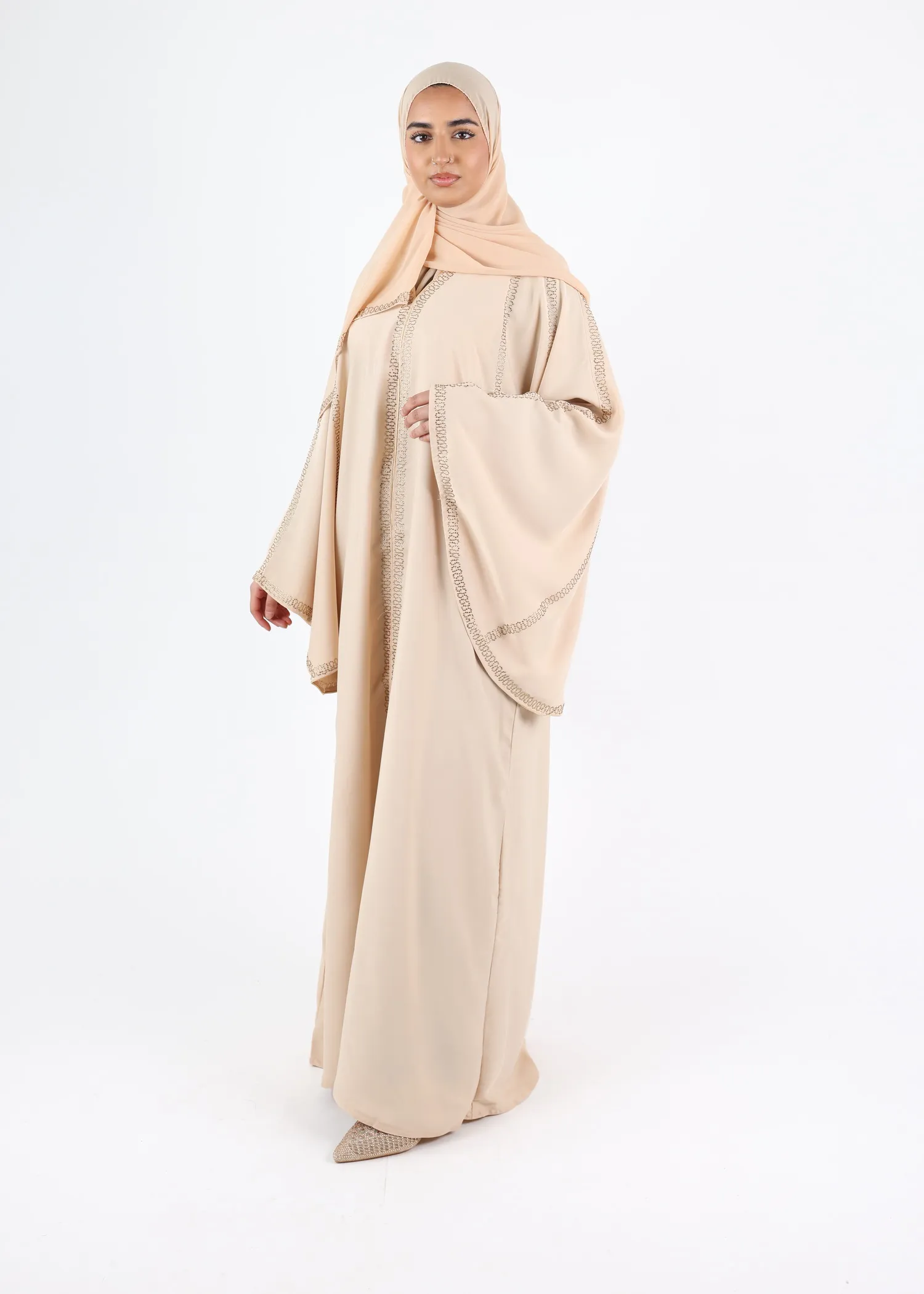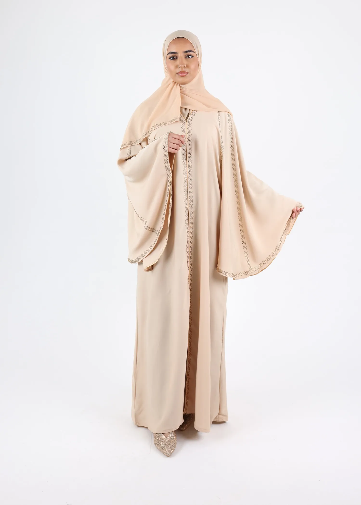 Abaya Zoulikha is adorned with intricate gold embroidery, adding a touch of opulence and glamour to your ensemble. Each delicate stitch is meticulously crafted, ensuring you stand out with unparalleled grace and sophistication.