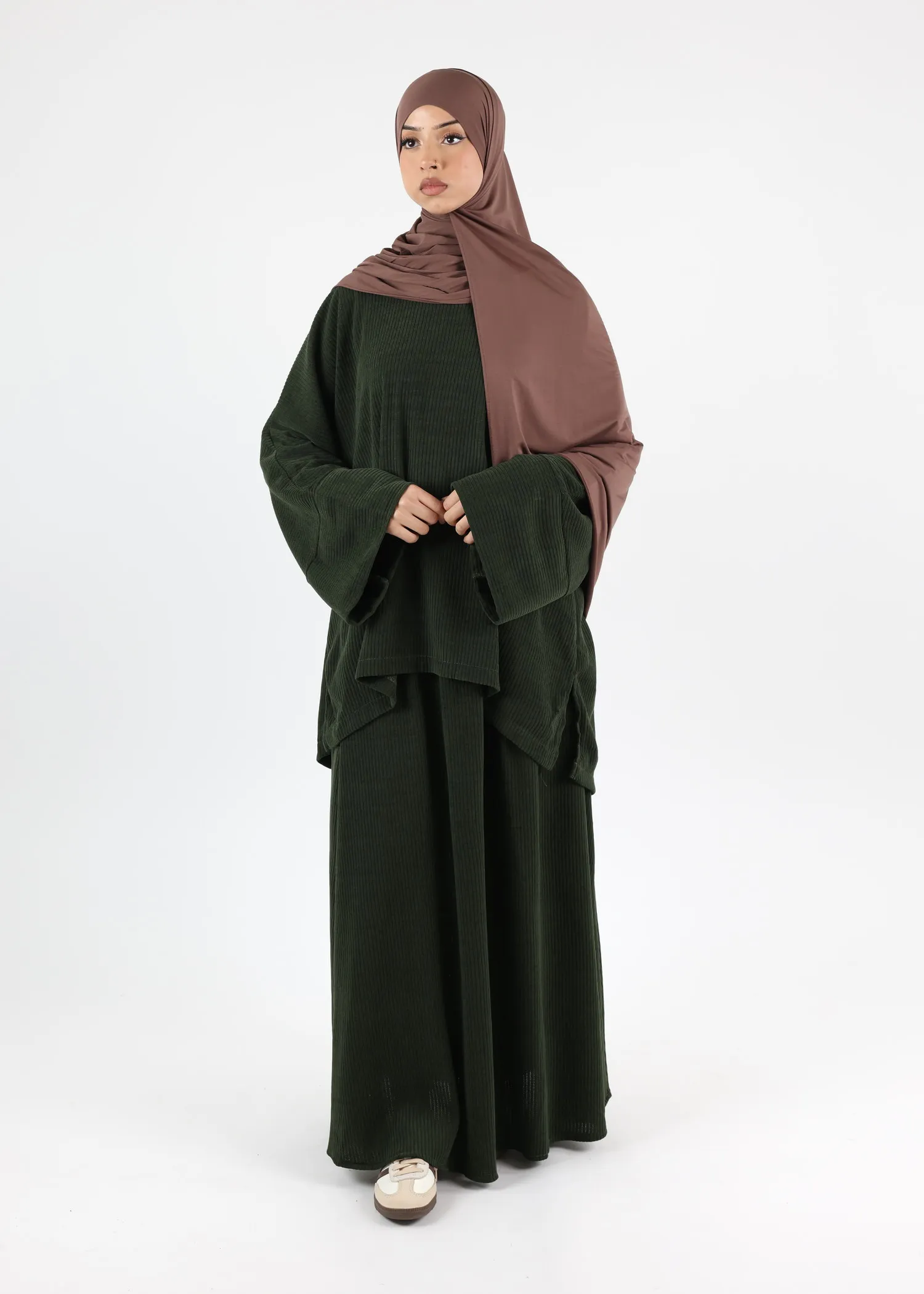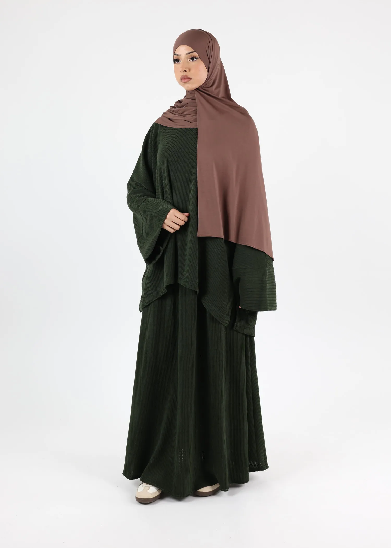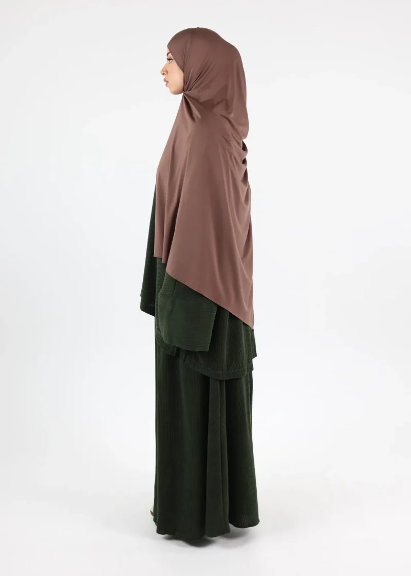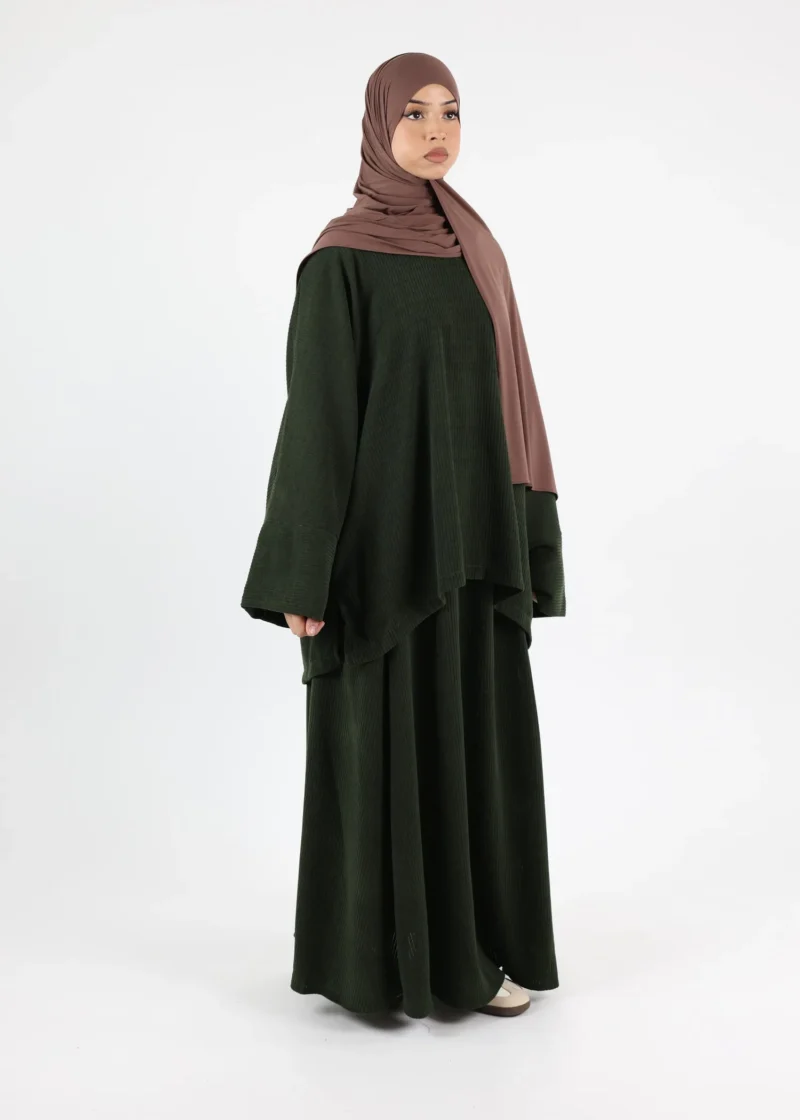 Discover the perfect winter wardrobe staple with our Arwa Corduroy Skirt Set, thoughtfully designed to offer both warmth and elegance. This set includes a loose-fitting top and a long skirt, providing a modest and stylish option ideal for the colder months. The luxurious corduroy fabric is not only soft to the touch but also provides exceptional warmth, making it a great choice for winter wear.