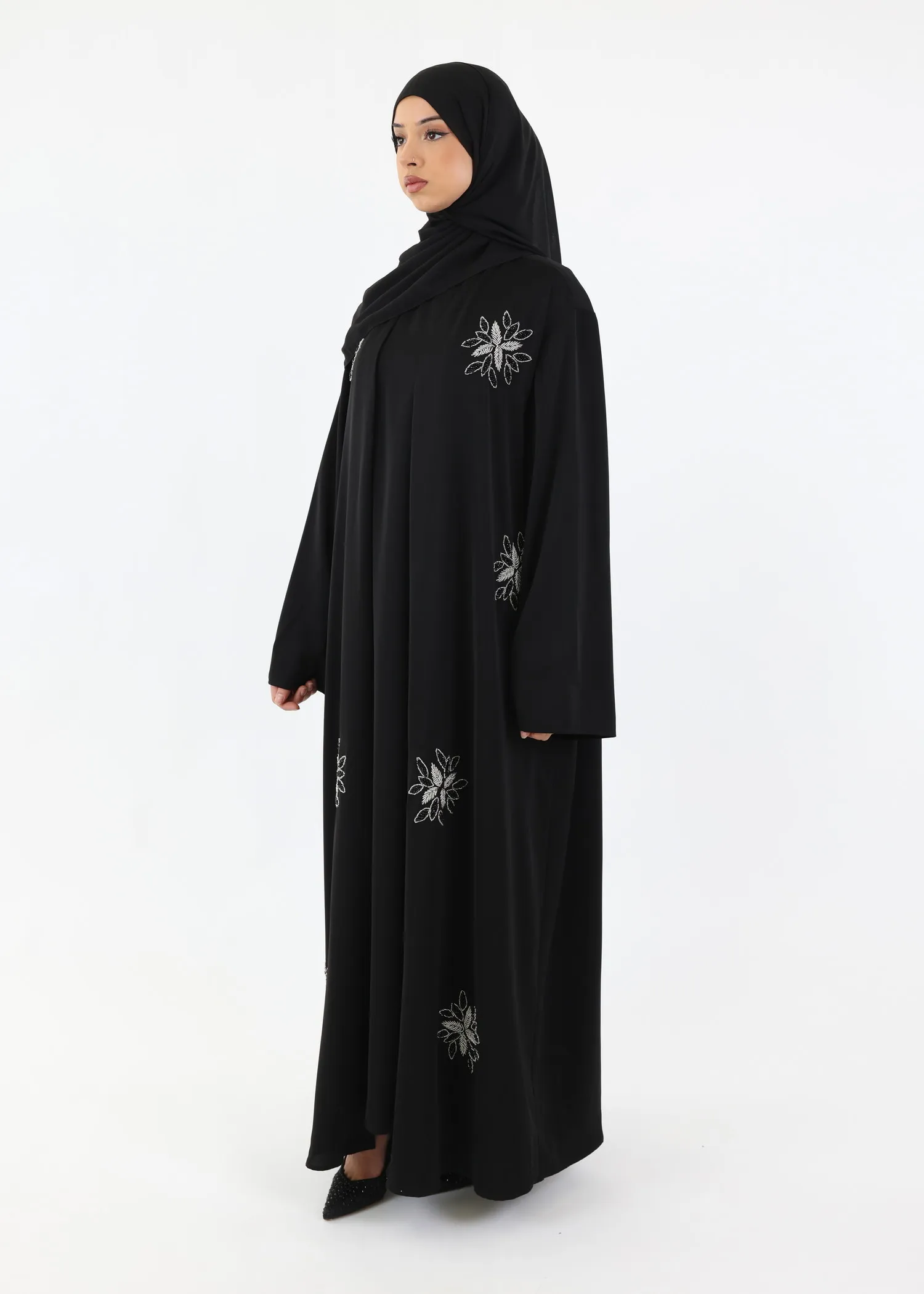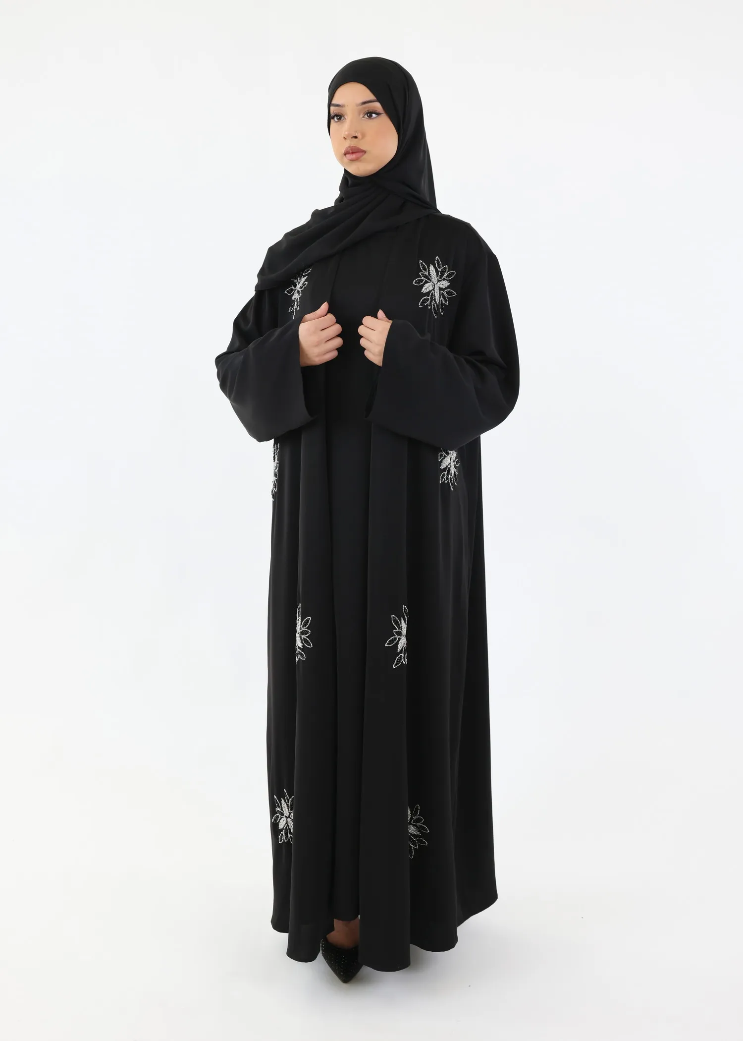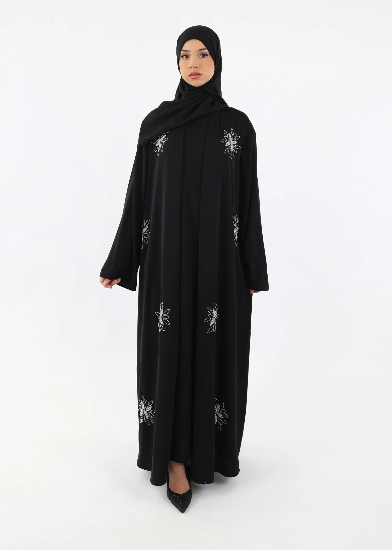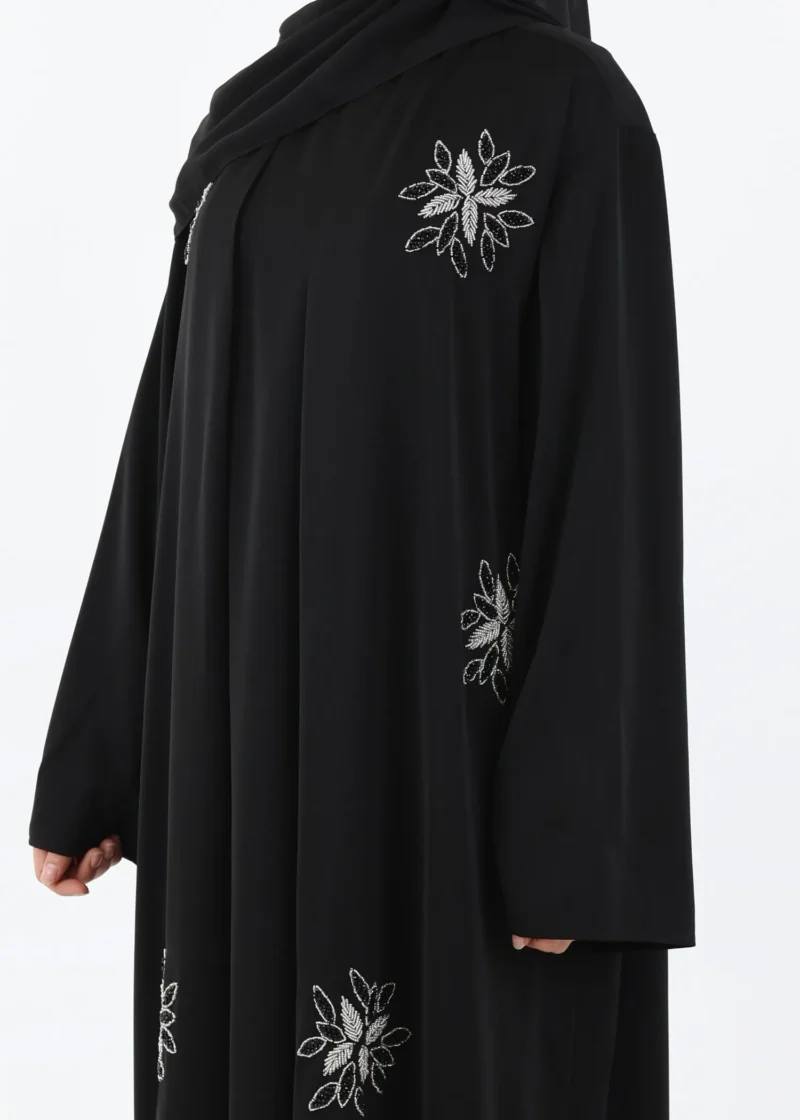 • Design: Black modest silhouette with handcrafted bead embellishments.