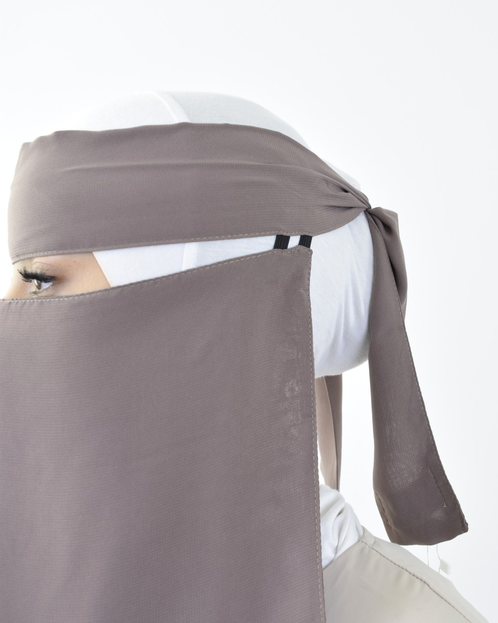 • Once lowered, the niqab must be tied again for a perfect fit when lifted back up.