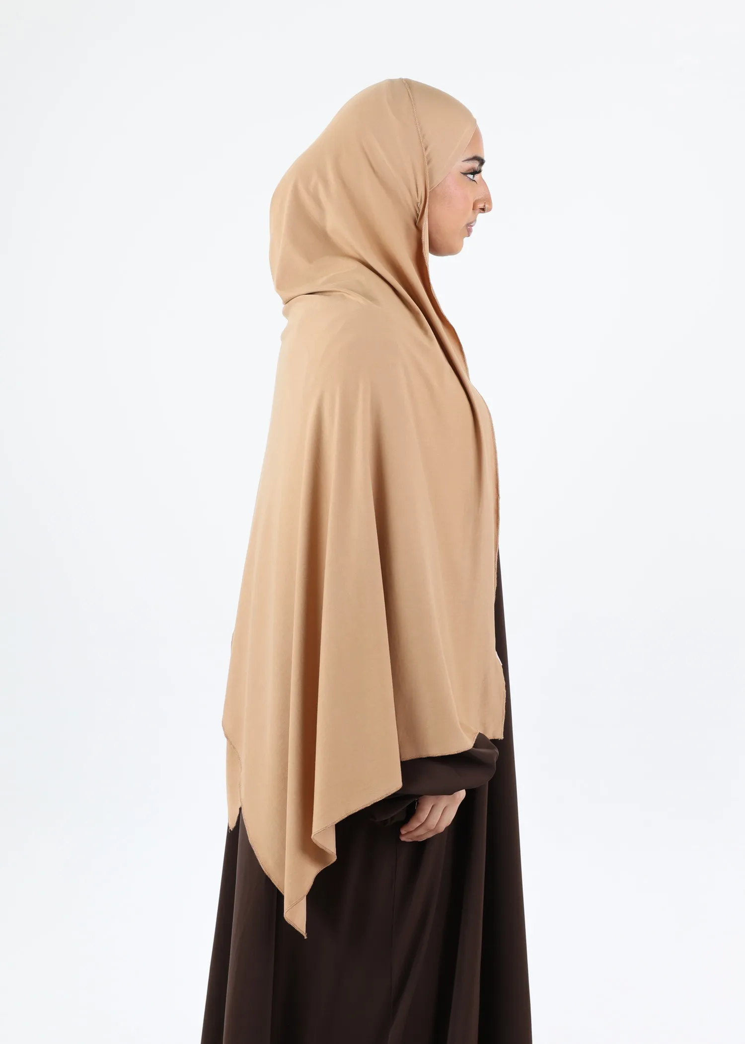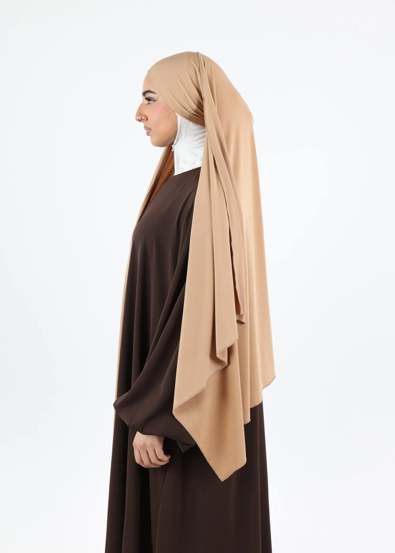 The design incorporates two panels: a shorter side and a longer side. The longer panel is specifically intended to be wrapped around the head and layered over, creating a smooth, elegant finish and ensuring a clean, refined silhouette. This wrapping style enhances the natural drape of the fabric while maintaining modest coverage.