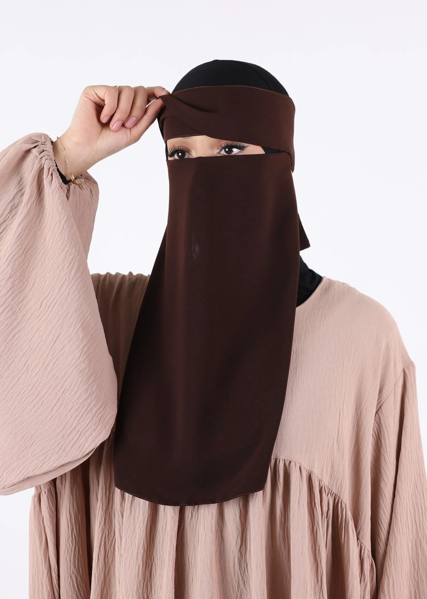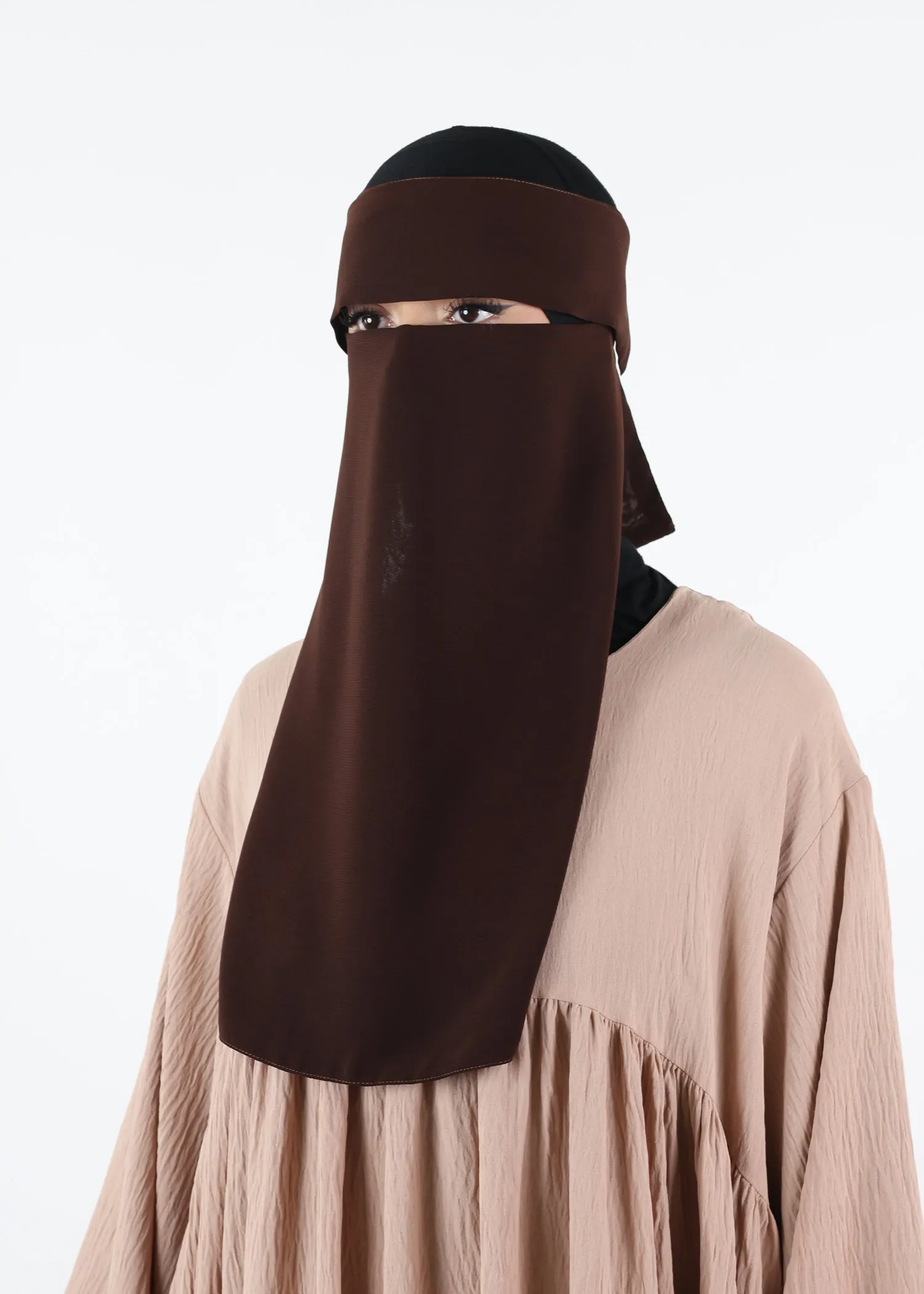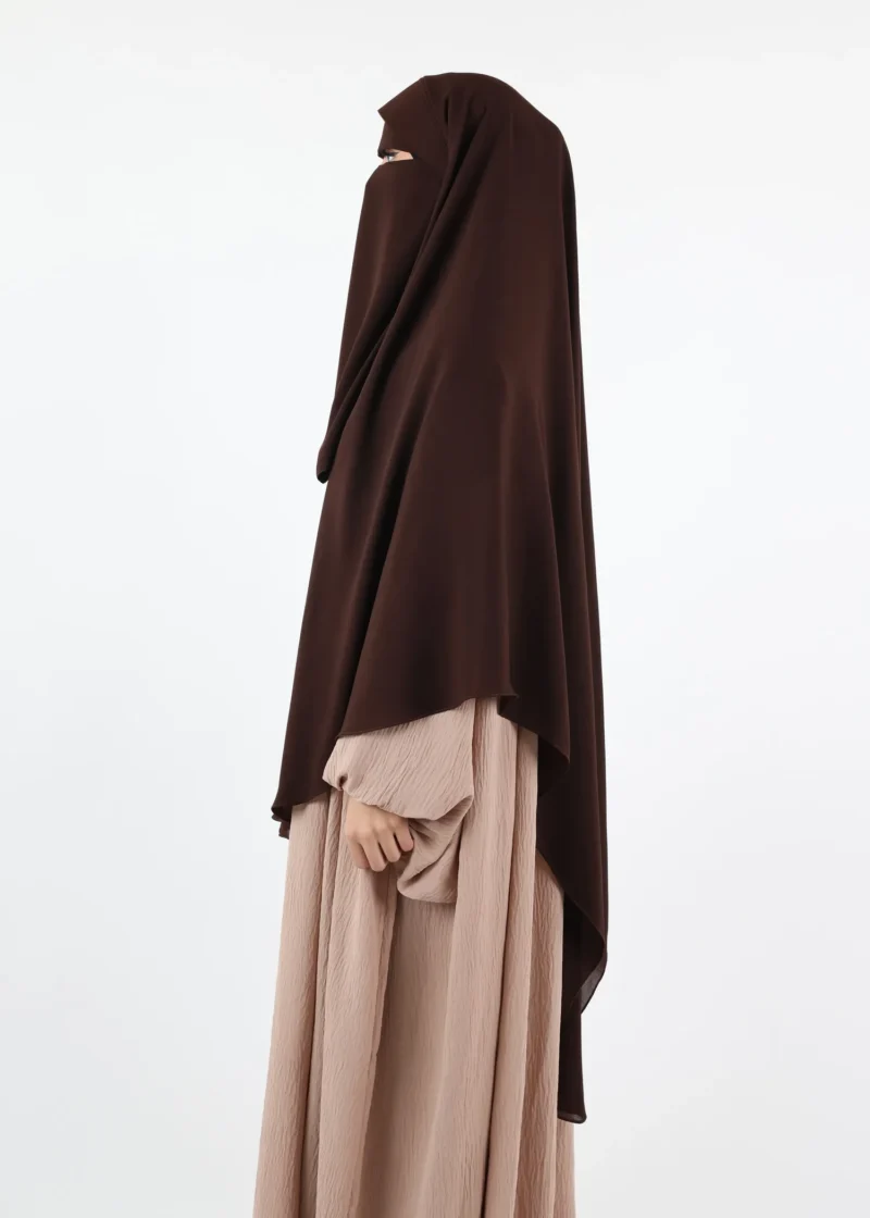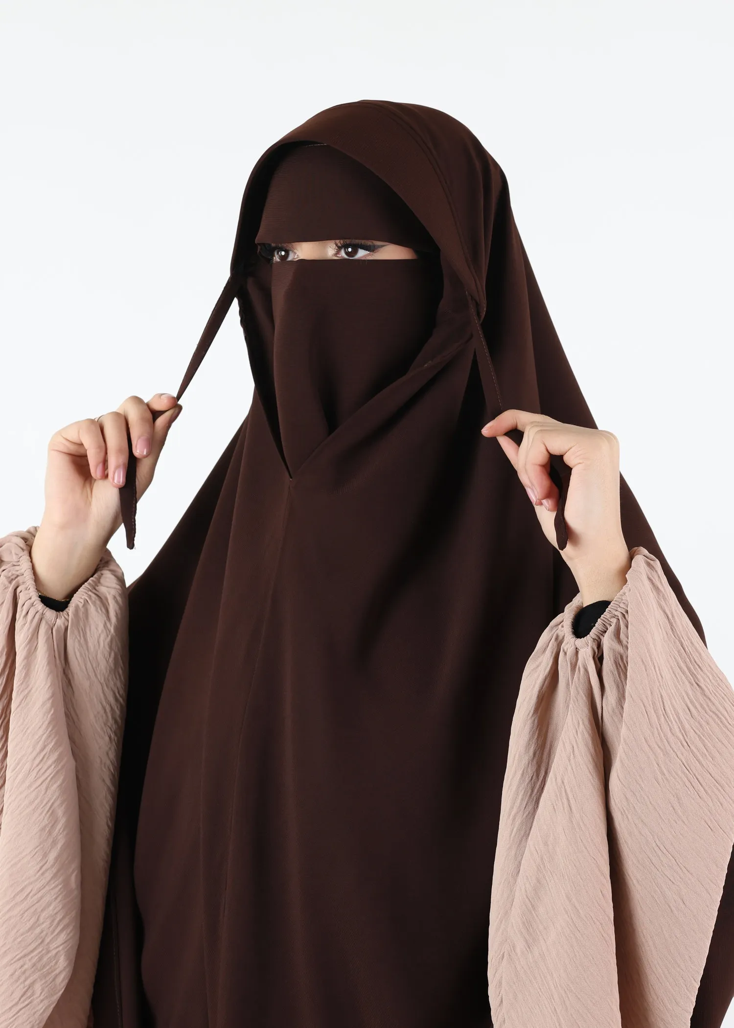 An independent full niqab with eye flap is included in the set. The niqab measures 42 cm in length and provides appropriate lower face coverage. It can be worn together with the khimar for complete coverage.
