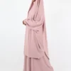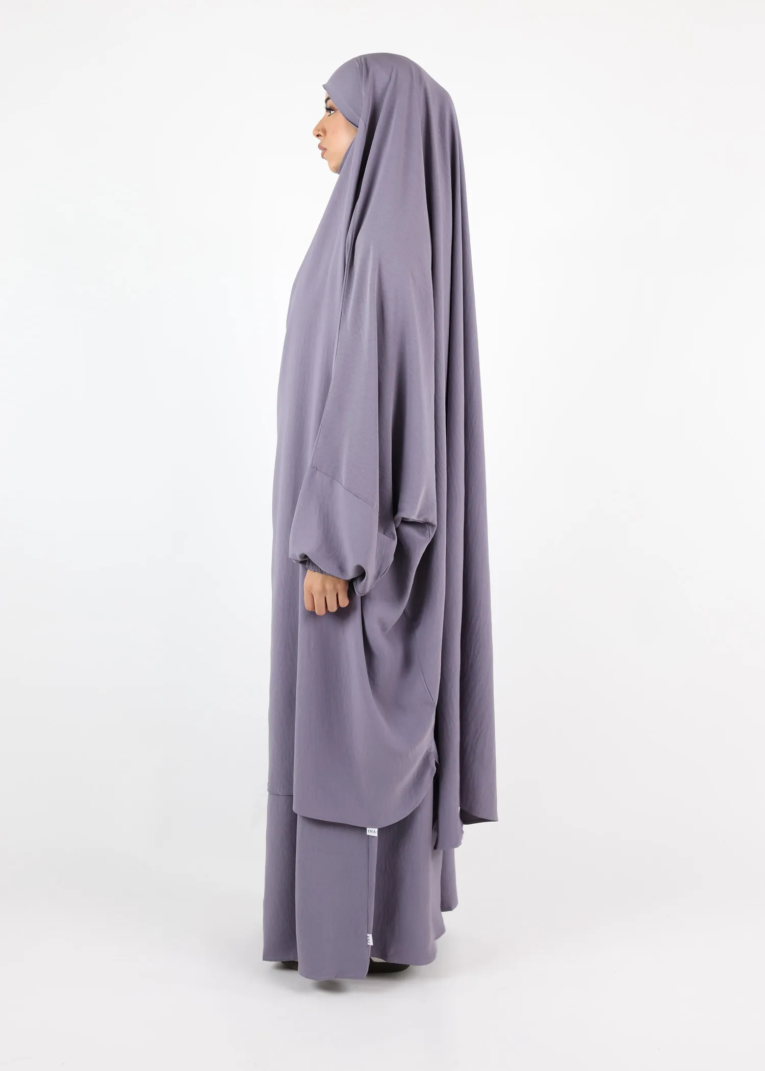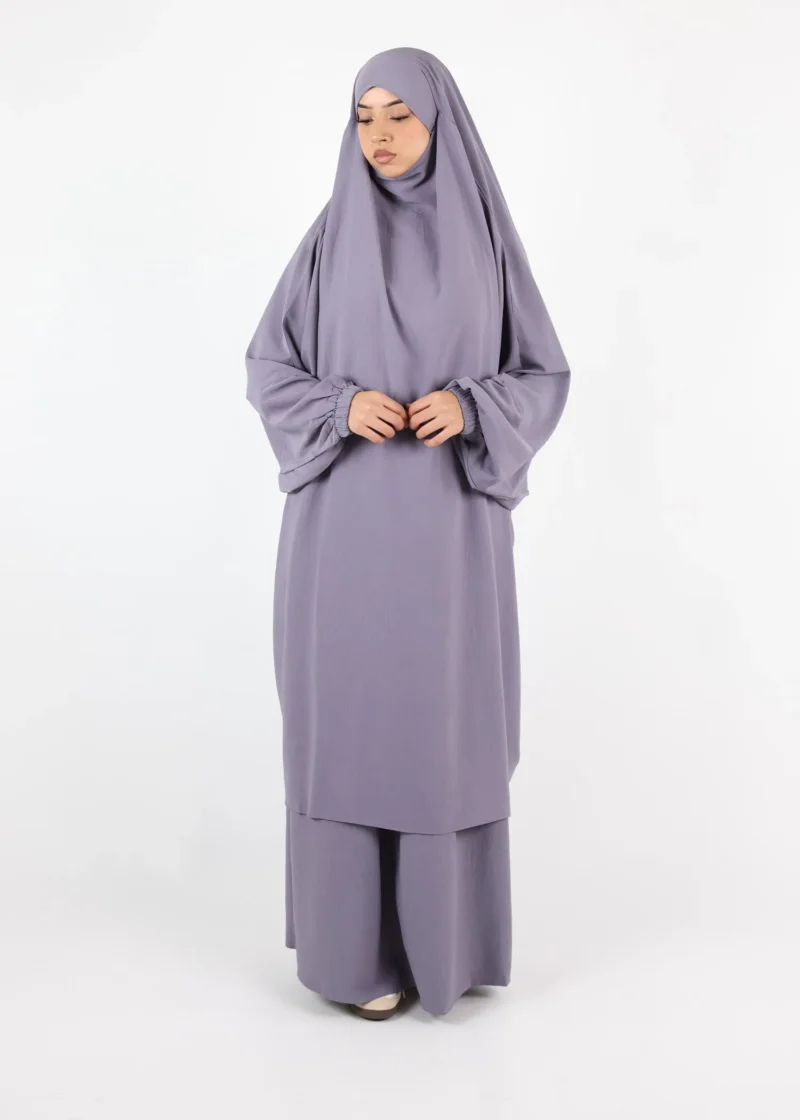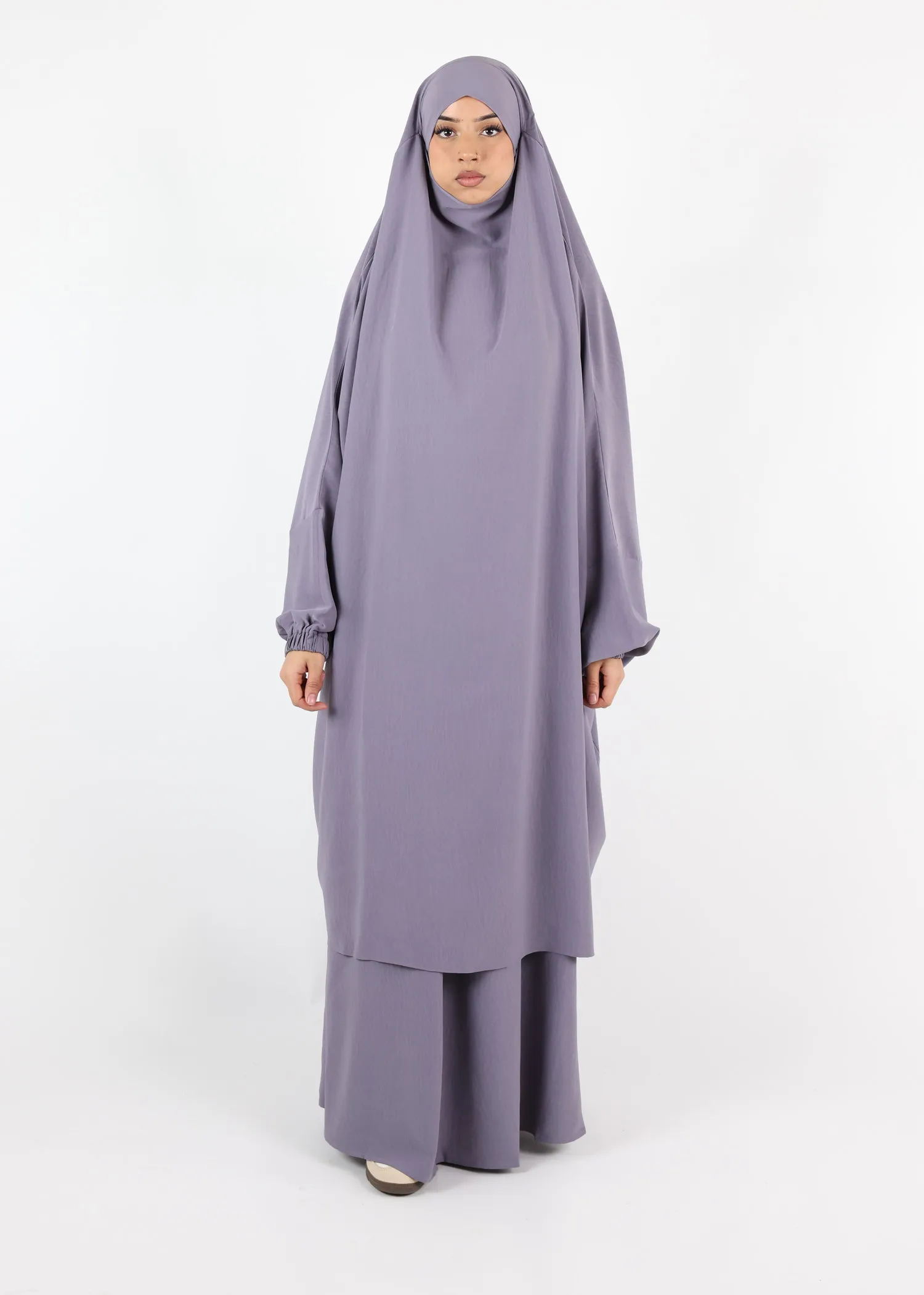 The set is composed of two pieces: a loose jilbab top and a matching skirt. The skirt is adjustable in length and can be folded to achieve the desired fit, allowing flexibility for different heights. The design is very practical, quick, and easy to put on, making it ideal for regular wear.