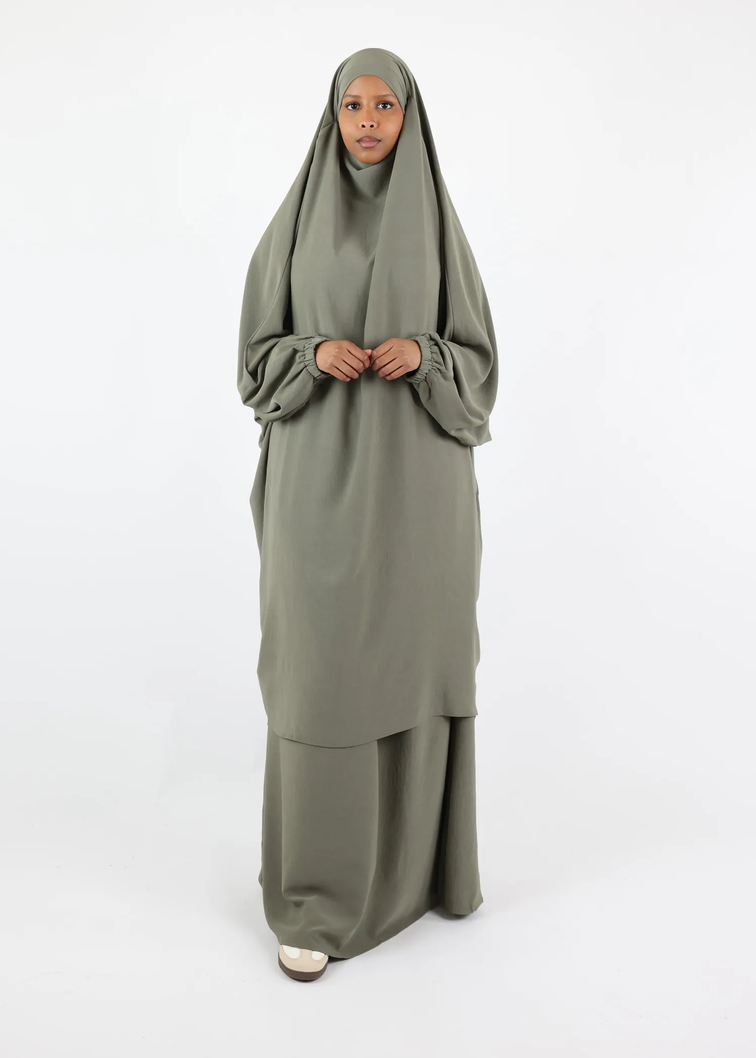 The set is composed of two pieces: a loose jilbab top and a matching skirt. The skirt is adjustable in length and can be folded to achieve the desired fit, allowing flexibility for different heights. The design is very practical, quick, and easy to put on, making it ideal for regular wear.