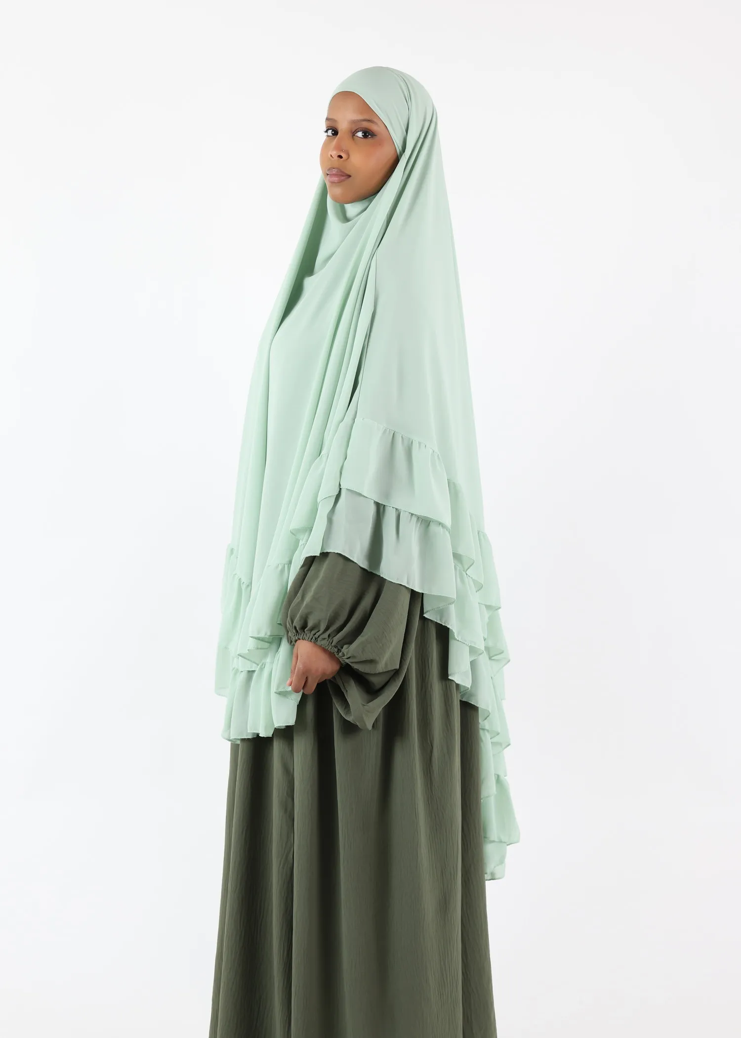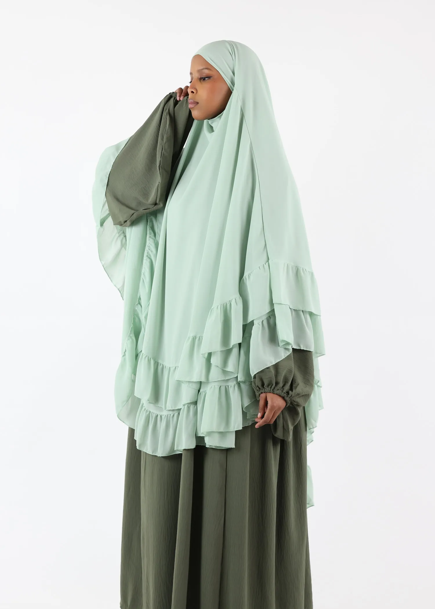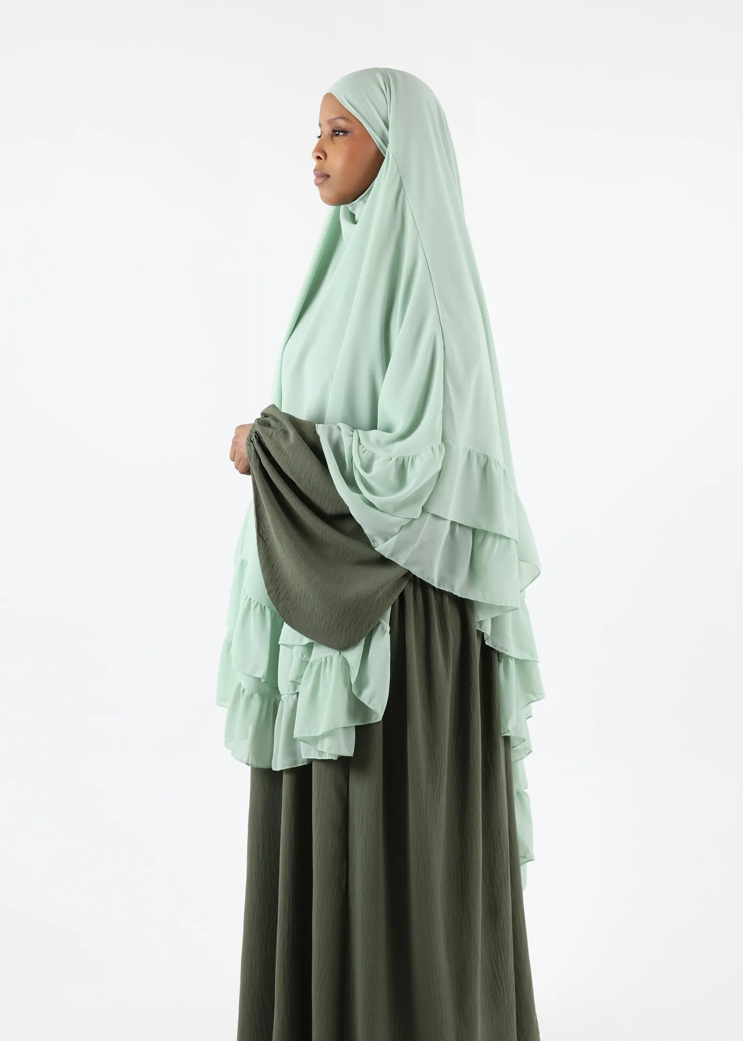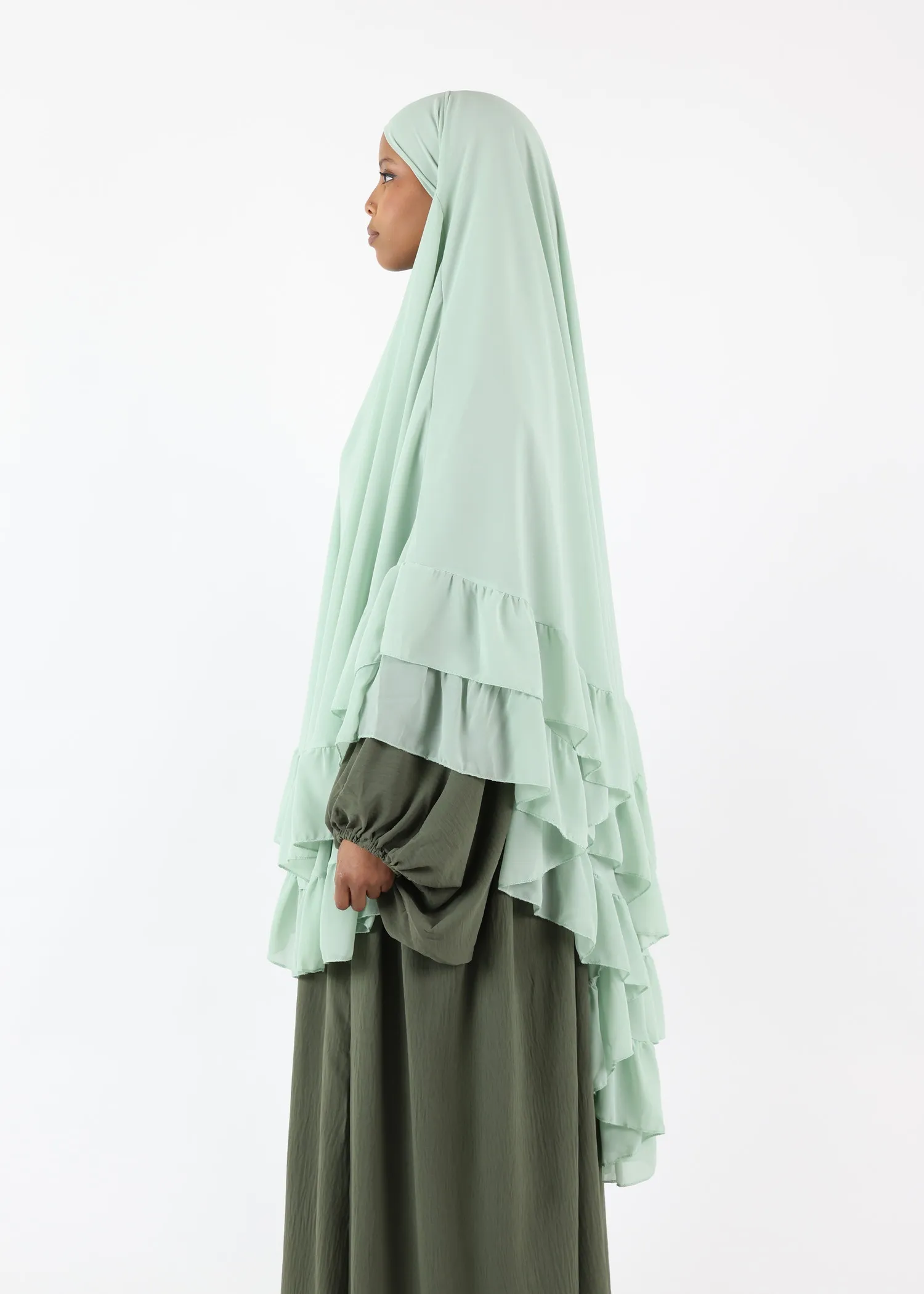 1. Elegant and Timeless Design: The Khaki colour paired with the ruffled layers makes this khimar suitable for any occasion, from casual outings to formal gatherings.