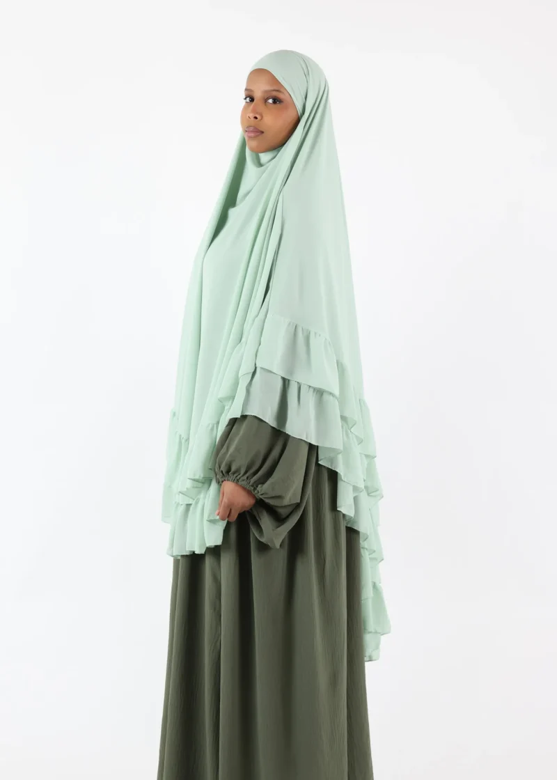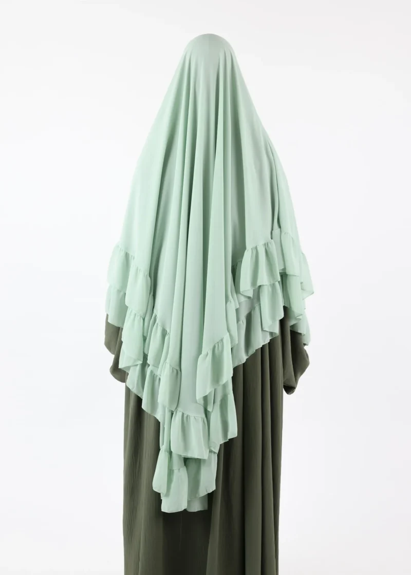 • Ruffled Detailing: The elegant ruffles enhance the khimar’s overall sophistication, giving it a unique and fashionable edge.