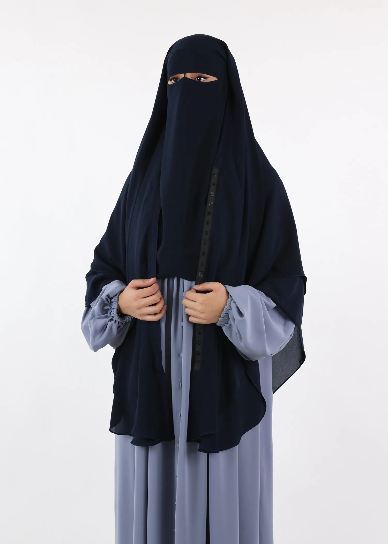 The Khimar in this set features a two-layer design, adding depth and dimension to your appearance. It comes with straps that allow you to tie it securely, ensuring it stays in place. The Niqab includes a nose string, enhancing comfort and fit. Additionally, the Khimar is closed with a strip of buttons, a thoughtful detail that adds to its functionality and aesthetic appeal.