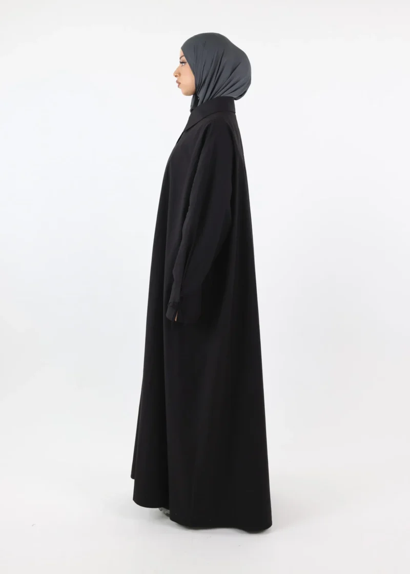A classic button-down front runs through the length of the abaya, allowing it to be worn fully closed as a dress or slightly open as a layering piece. This adds versatility, making it easy to adapt depending on the outfit or occasion. The structured collar brings a refined finish, giving the piece a more elevated and tailored appearance compared to standard abayas.