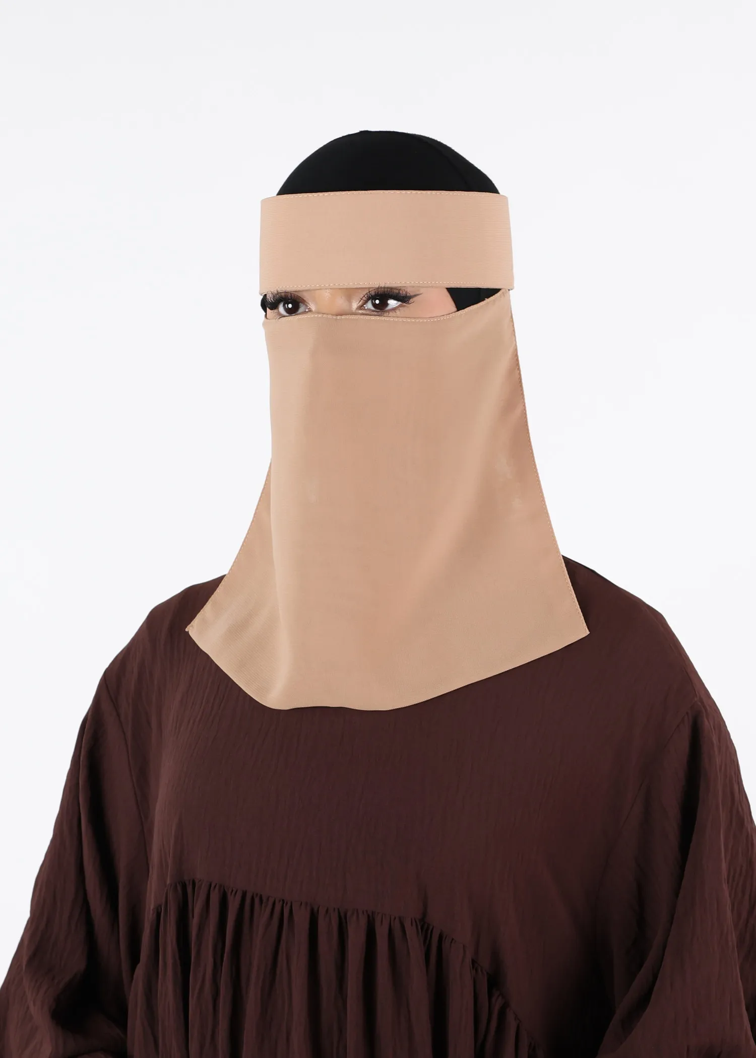 The soft, structured headband provides stable positioning on the head without excessive pressure, making it comfortable for extended wear. The design ensures the niqab sits neatly and securely, helping maintain a polished and consistent look throughout the day.